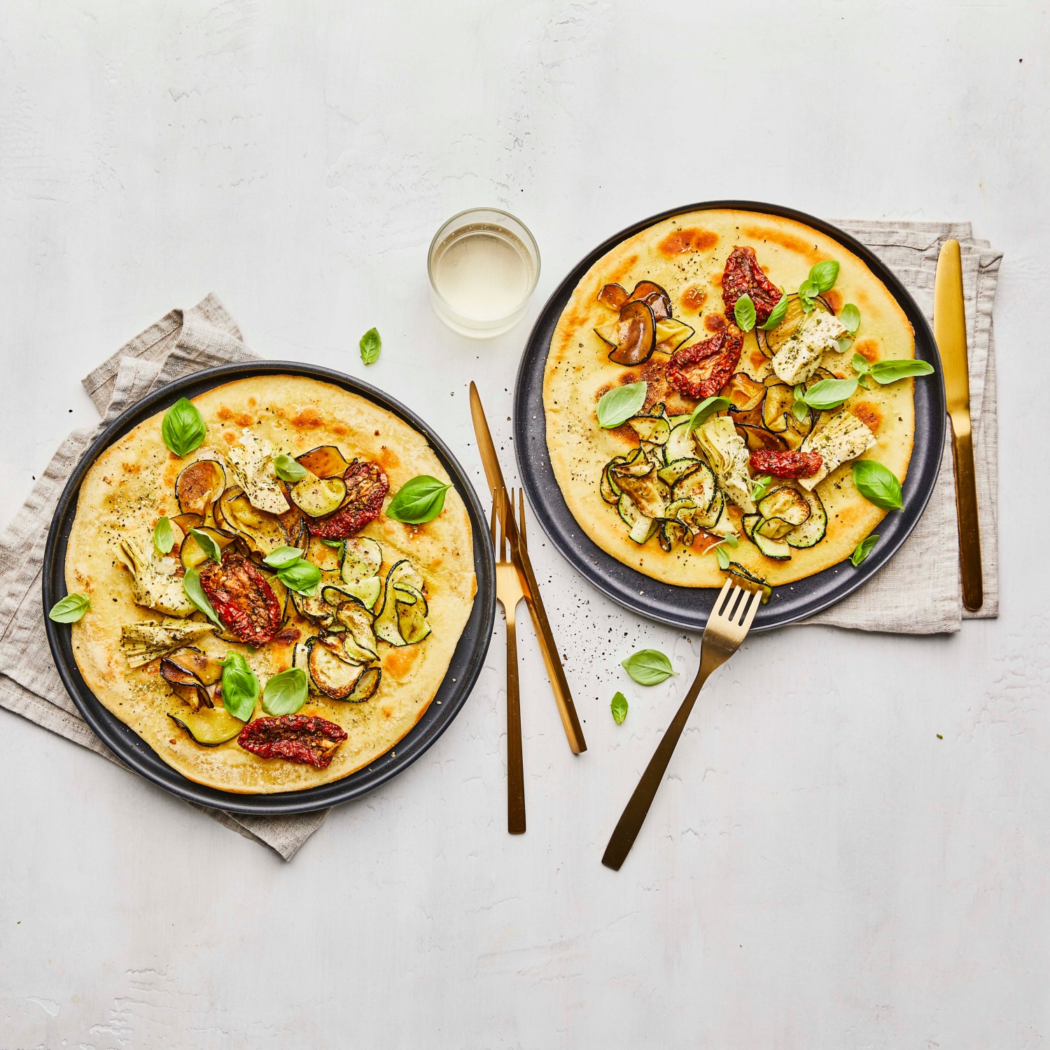 - Die Pinsa-Fladen mit den vorbereiteten Auberginen- und Zucchinischeiben, den abgetropften Artischocken und den getrockneten Tomaten aus dem Glas belegen.