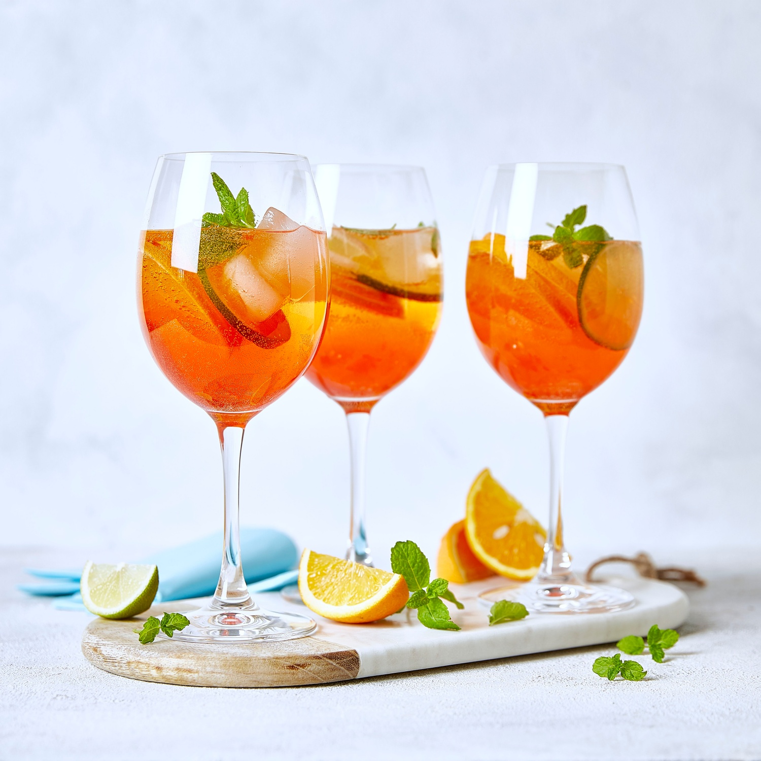 - Die Orangen- und Limettenscheibe mit ein paar Eiswürfeln in ein Glas geben. Mit dem Apice, dem Prosecco und einem Schuss Mineralwasser auffüllen. Mit Minze garniert servieren.