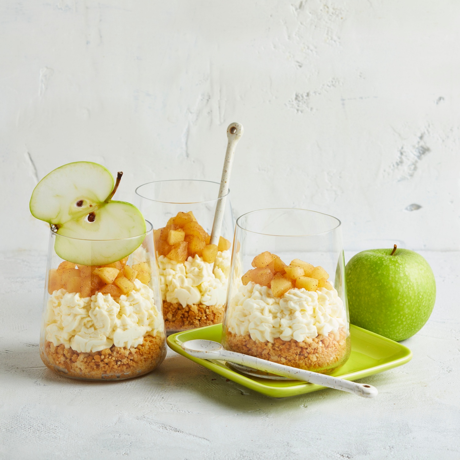 Crunchy Keksboden, luftiger Frischkäse und als Topping ein süßer Traum aus Zimt und Apfelstücken – der Apfel-Cheesecake ohne Backen ist ein Dessert zum Verlieben! Zum Rezept