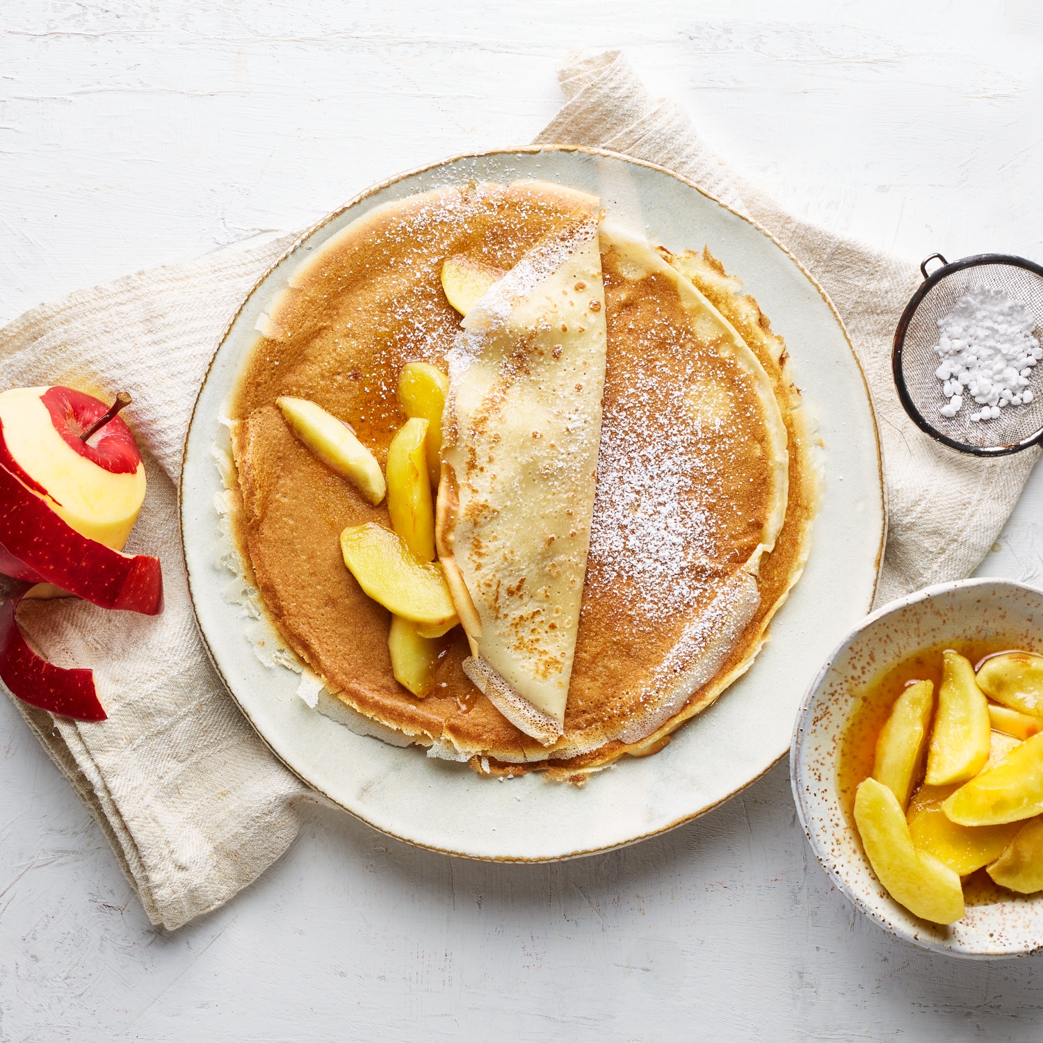 Mit den Apfelspalten anrichten und mit Puderzucker bestreuen. Die Apfel-Crêpes noch warm servieren.