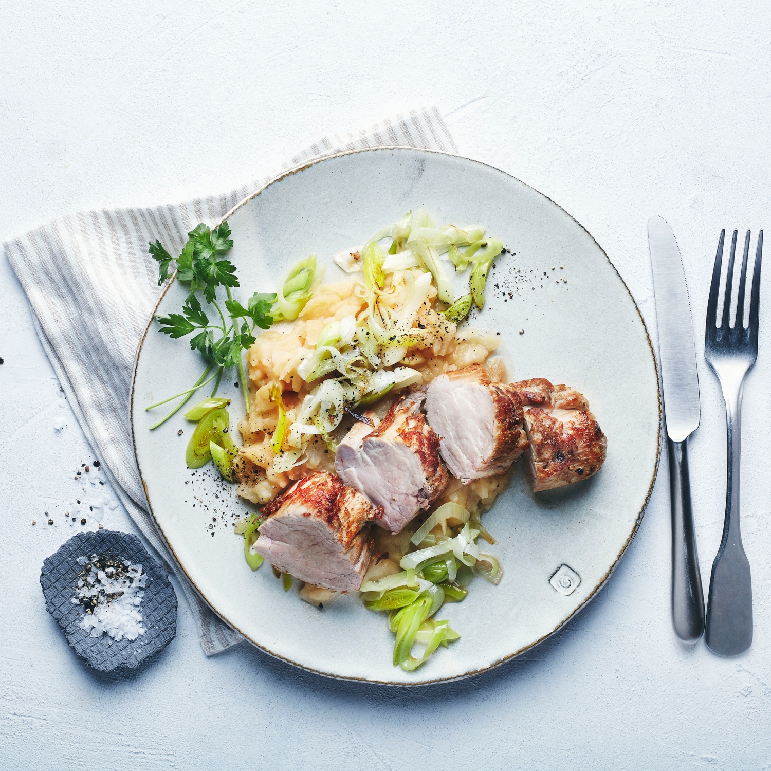 6. Das Schweinefilet aus dem Ofen nehmen und in Medaillons schneiden. Zusammen mit dem Stampf und dem Lauchgemüse anrichten und servieren.