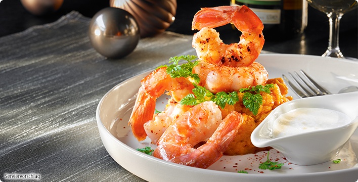 Argentinische Rotgarnelen mit Karottenpüree und Ingwersauce