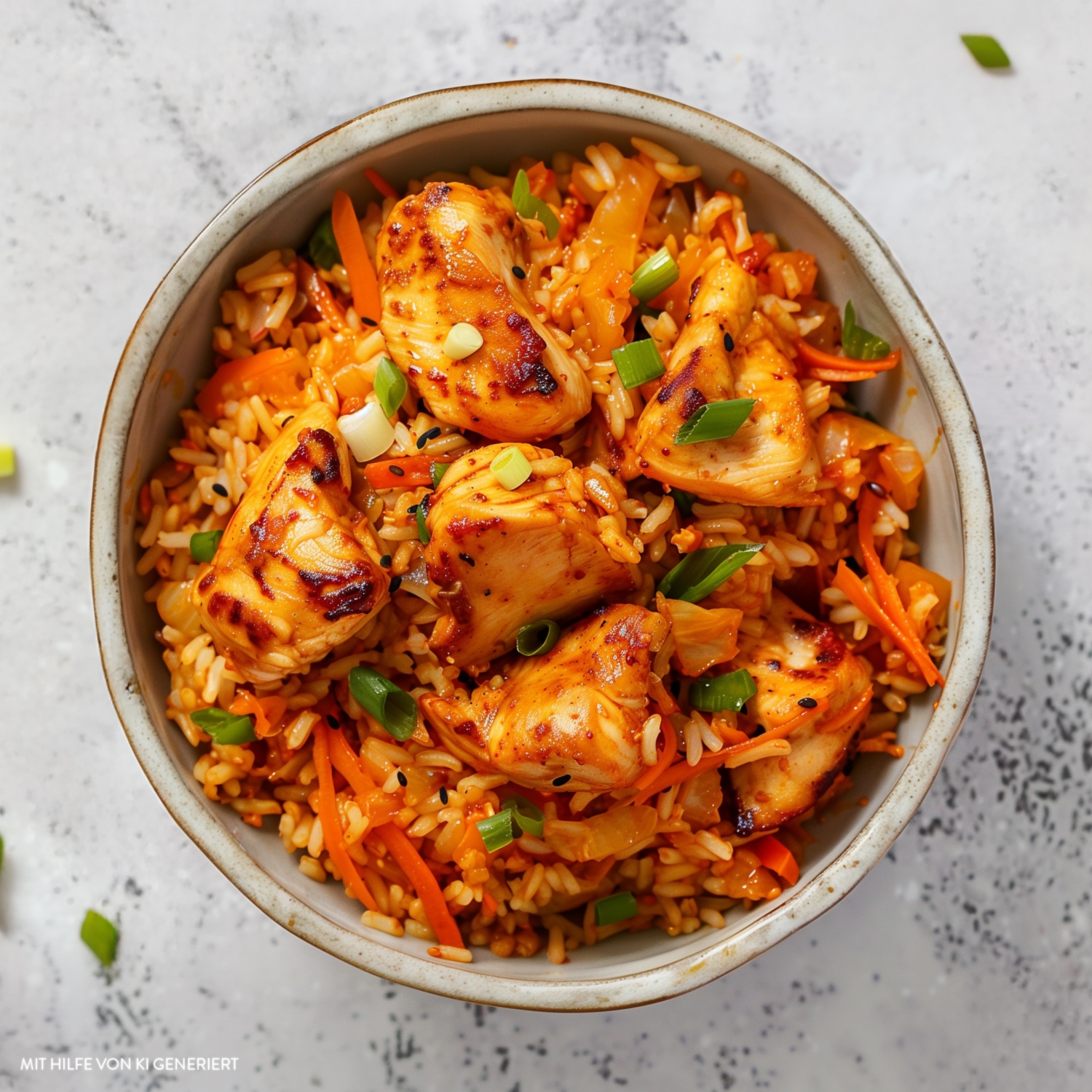 Ein würziges Pfannengericht, das saftiges Hähnchenfleisch mit fermentiertem Kimchi und Reis kombiniert.