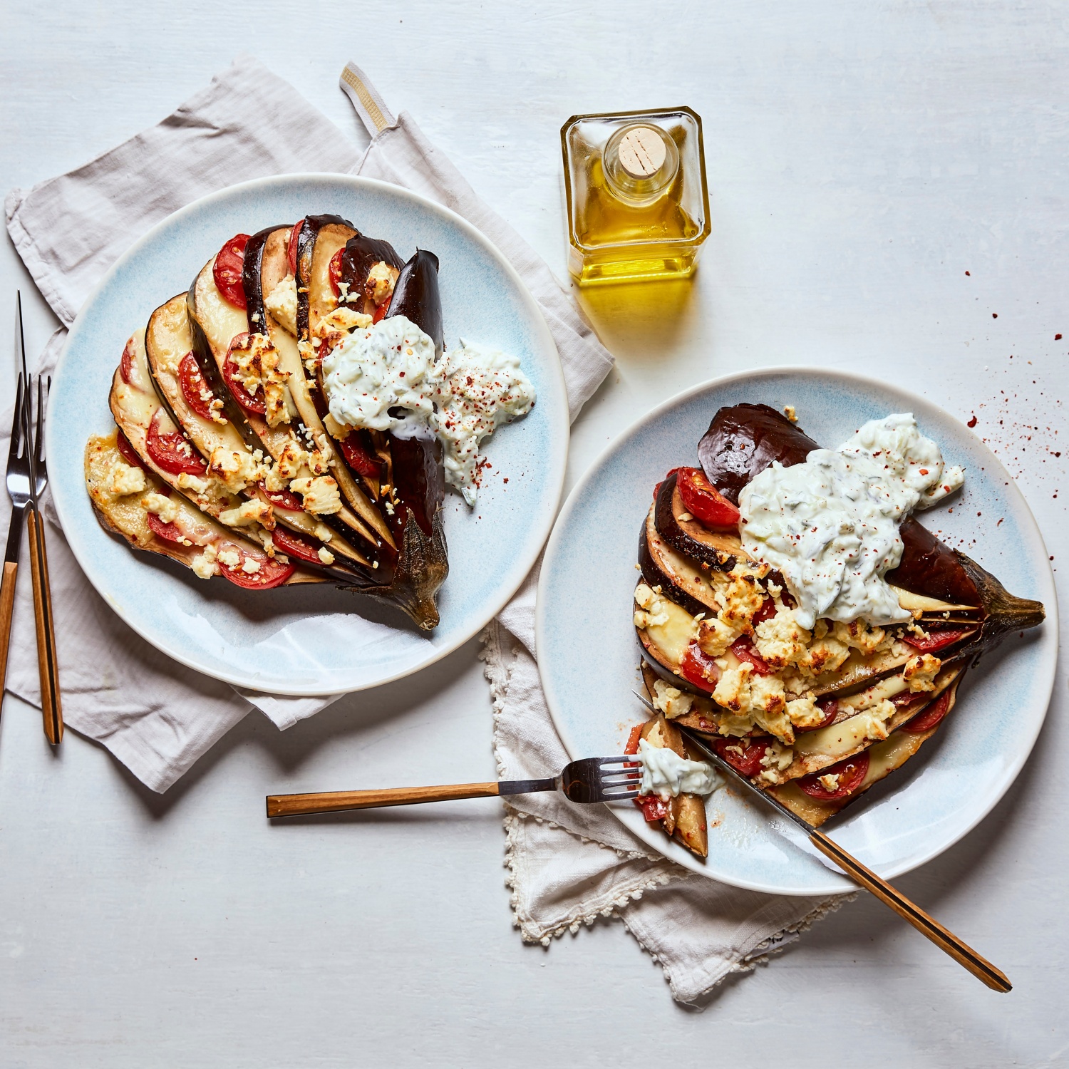 3. Die Auberginen mit dem Olivenöl beträufeln und mit dem Pfeffer und dem Chilisalz würzen. Den Feta zerbröseln und über die Auberginen-Fächer streuen. Im vorgeheizten Ofen bei 180 °C Umluft (200 °C Ober- und Unterhitze) 20 Minuten backen.