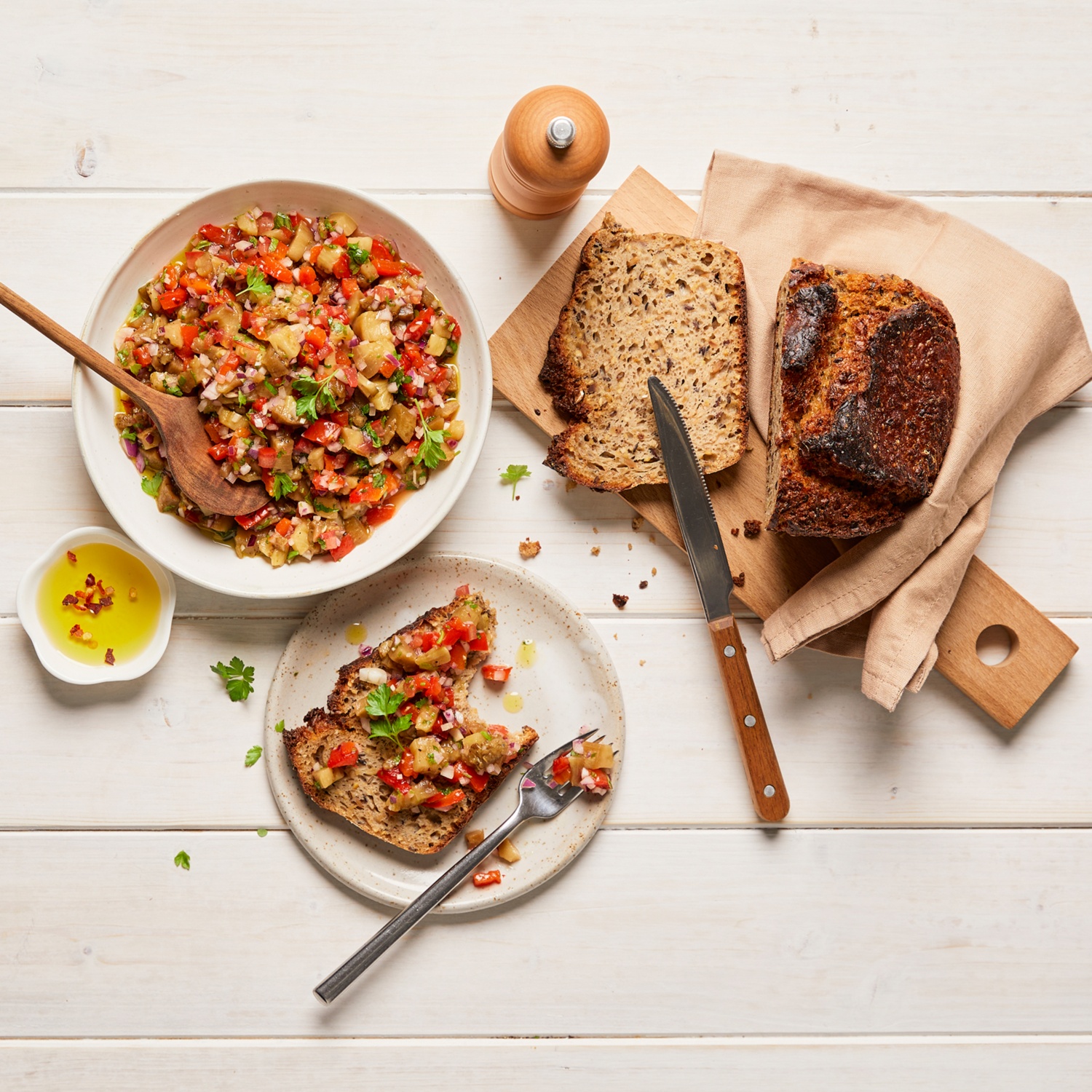 - Die Auberginen- und Paprikawürfel mit den Zwiebeln, dem gepressten Knoblauch, den Tomaten und der Petersilie vermischen. Das Olivenöl, den Essig und etwas Zitronensaft unterheben. Mit Chilisalz und Pfeffer abschmecken.