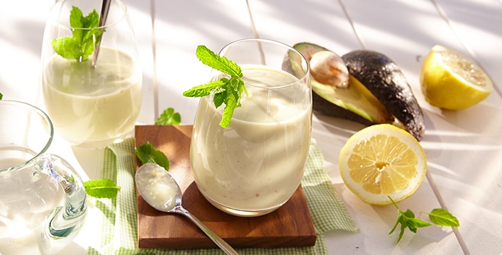 - Avocado schälen und den Kern entfernen. Apfel mit Schale in Stücke schneiden und beides mit der Buttermilch pürieren. Zitrone auspressen und dazugeben. Nach Bedarf mit etwas Honig süßen und mit Minze anrichten.