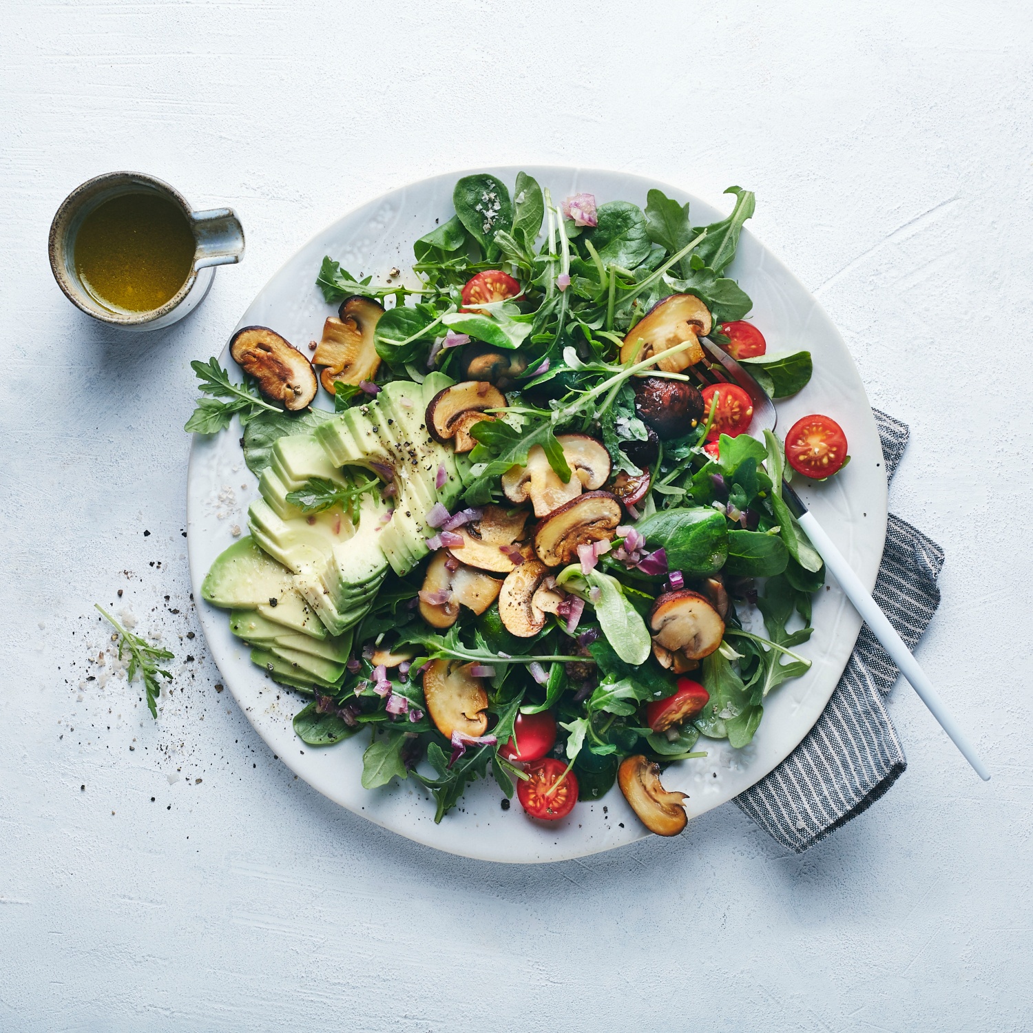 - Den Salat mit den Avocadoscheiben und den Tomaten auf Tellern anrichten. Die gebratenen Champignons darauf geben und mit dem Dressing servieren.