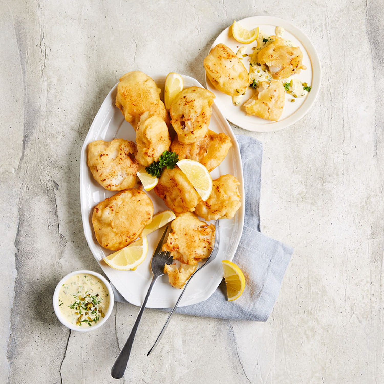 - Den Fisch durch den Teig ziehen und ins heiße Öl geben. Etwa 5 Minuten lang frittieren, bis er knusprig ist. Auf Küchenpapier kurz abtropfen lassen und zusammen mit der Remoulade servieren.