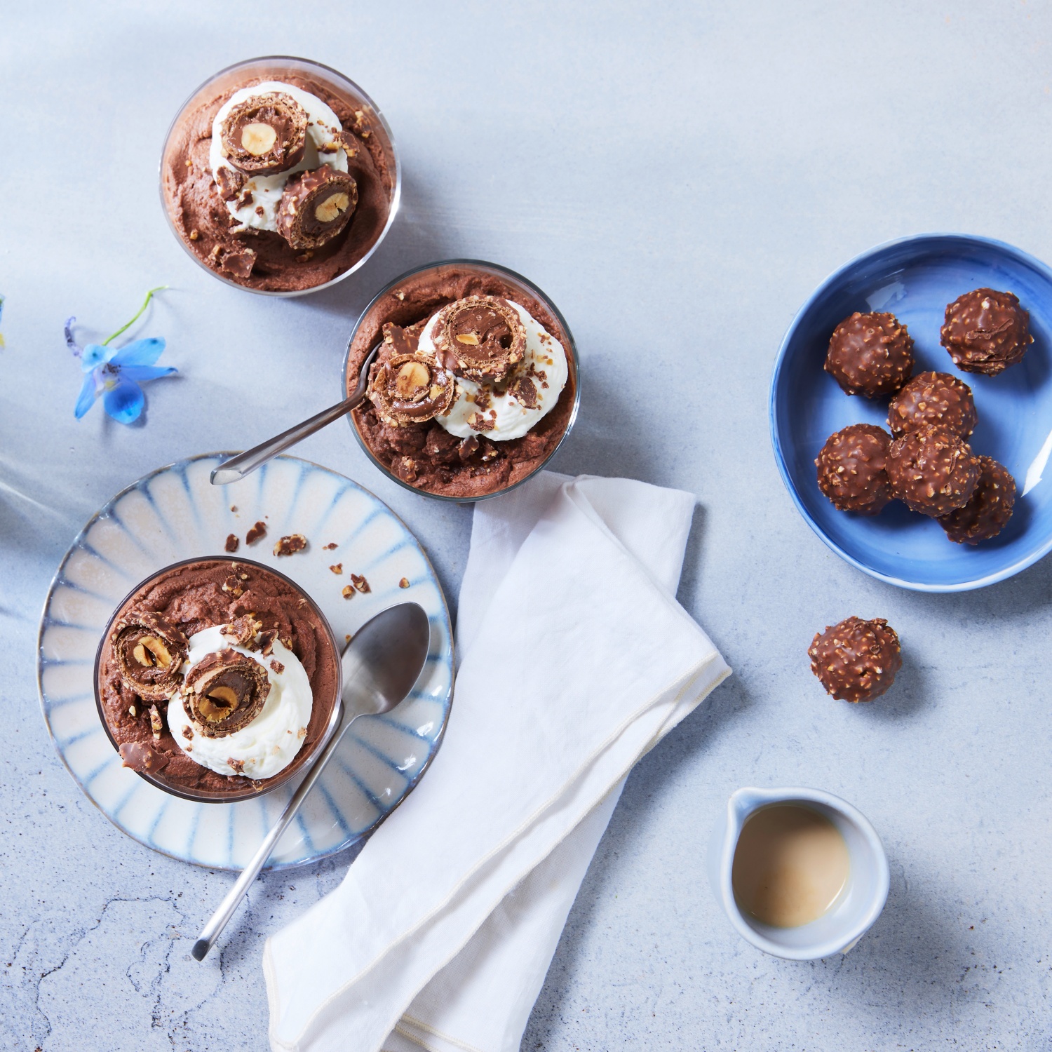 - Die Pralinen auspacken und vier davon in kleine Stücke schneiden. Die Stückchen unter die steif geschlagene Schokoladensahne ziehen. In vier Portionsgläser füllen.