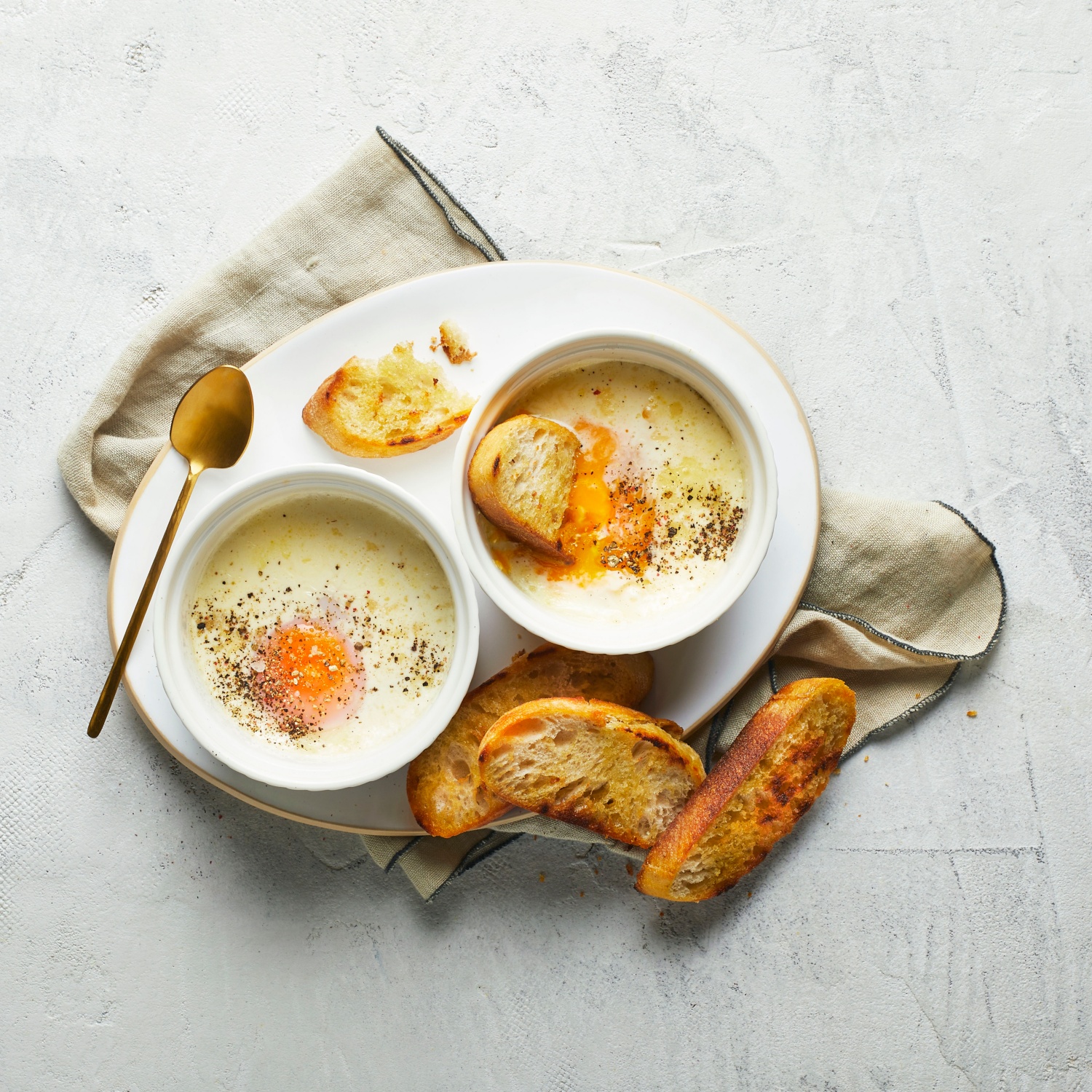 Baked Eggs, gebackene Eier oder auch Oeuf Cocotte. Wenn Eier im Ofen mit Sahne und Käse verschmelzen, kann man nur eins machen: knuspriges Baguette hineintauchen und genießen. Zum Rezept