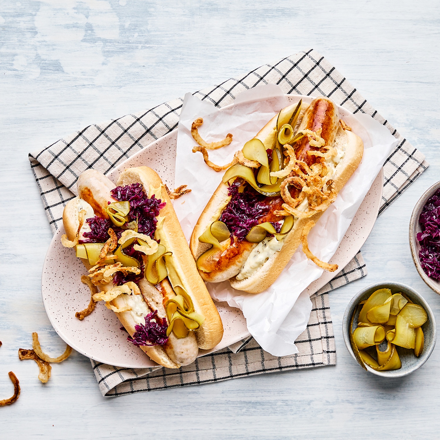 5. Die Hot Dog Brötchen mit dem Senf und der Remoulade bestreichen, mit der Bratwurst, dem Rotkohl und den Gurkenscheiben belegen und mit den Röstzwiebeln bestreut servieren.