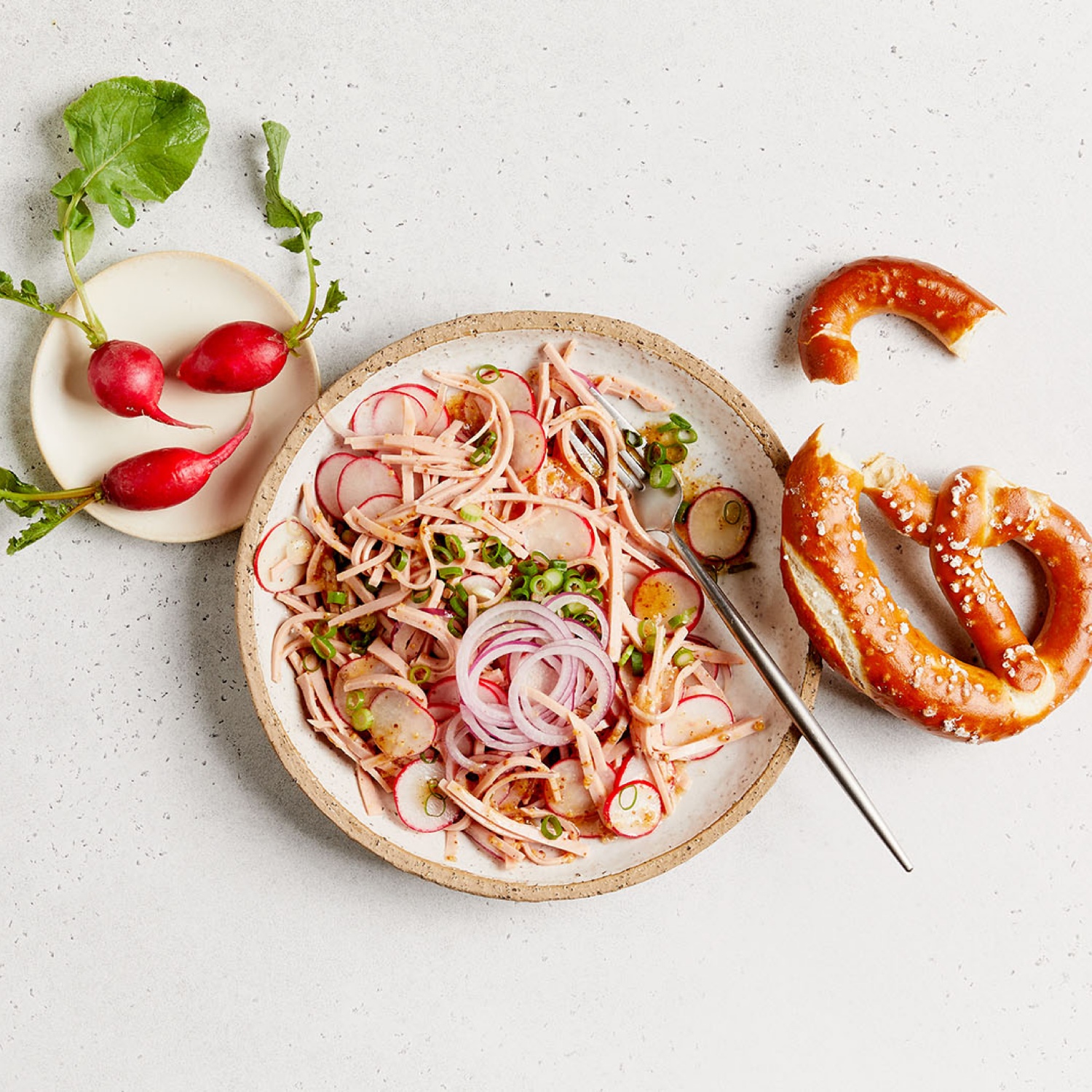 Bayerischer Spezialität: Wurstsalat mit Zwiebel und Radieschen ist ein echtes Nationalgericht. Nur kurz ziehen lassen und fertig ist der Salat. Zum Rezept