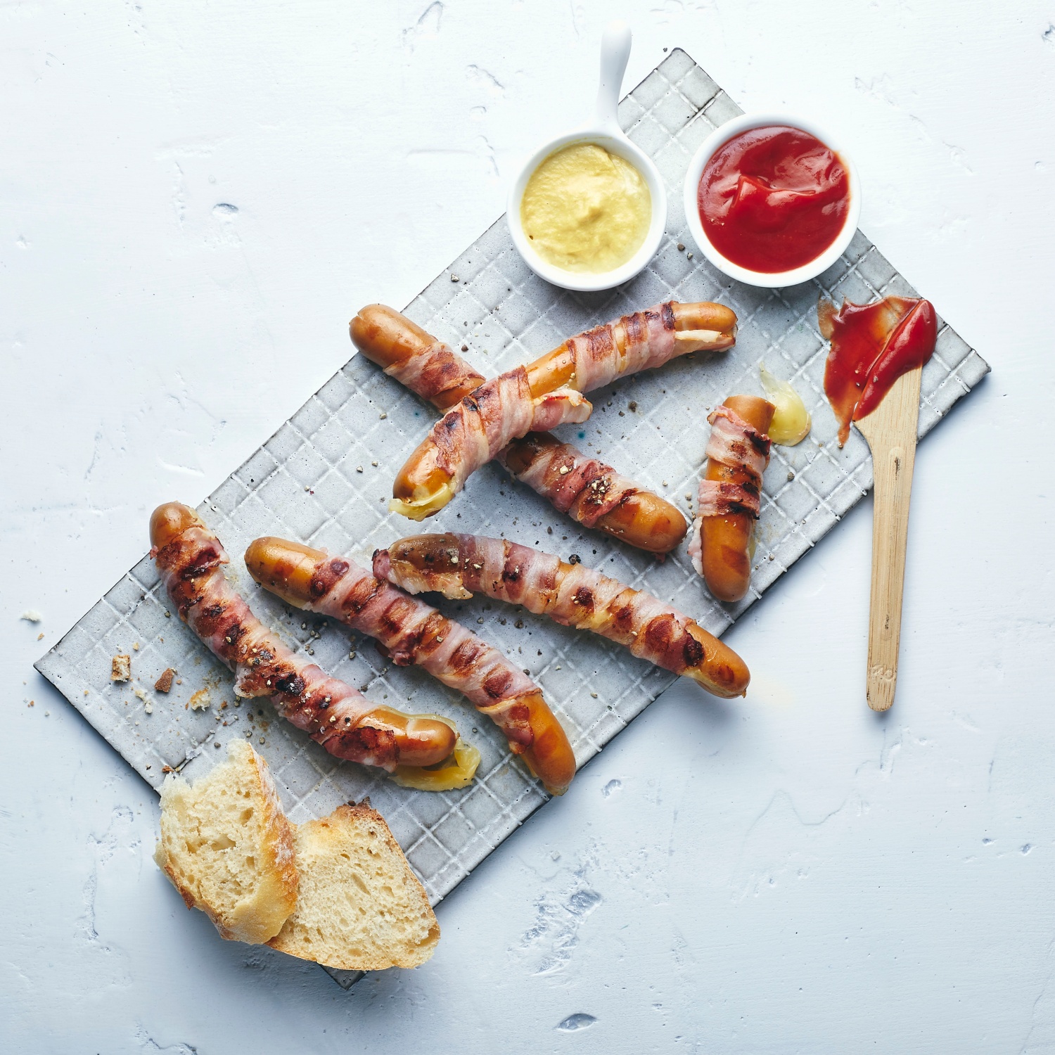 - Die gefüllten Würstchen jeweils mit zwei Scheiben Bacon umwickeln.