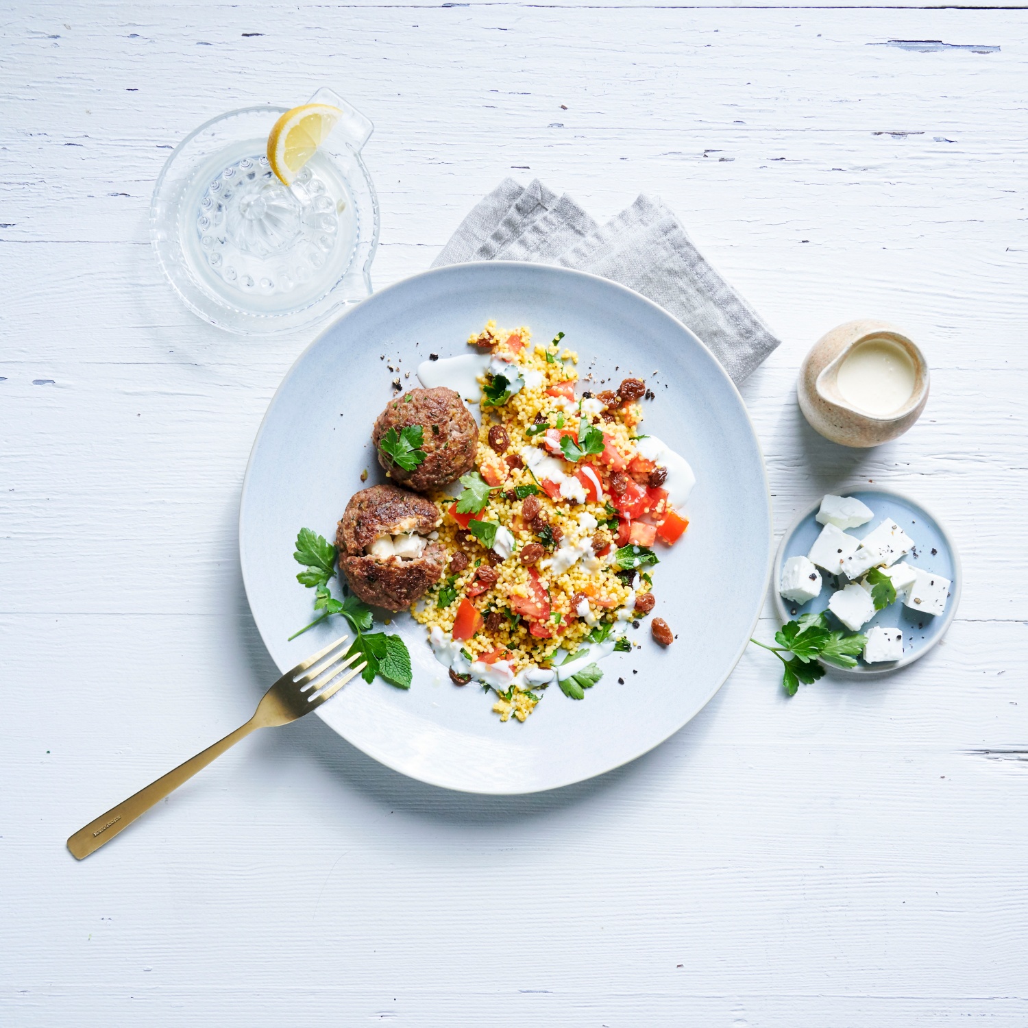 Bifteki mit Feta, Hirsesalat und Zitronensauce