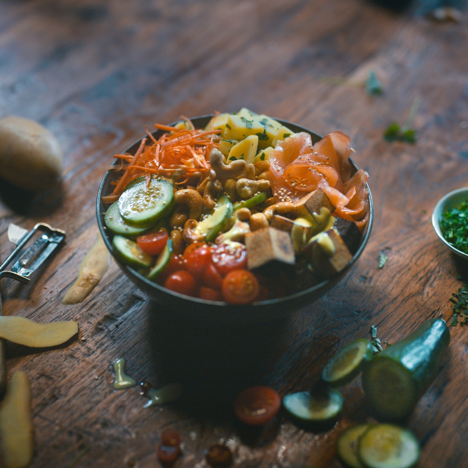- Die Kartoffeln mit gehackter Petersilie garnieren, die Cashewkerne kurz in einer Pfanne anrösten und anschließend die Bowl schön anrichten.