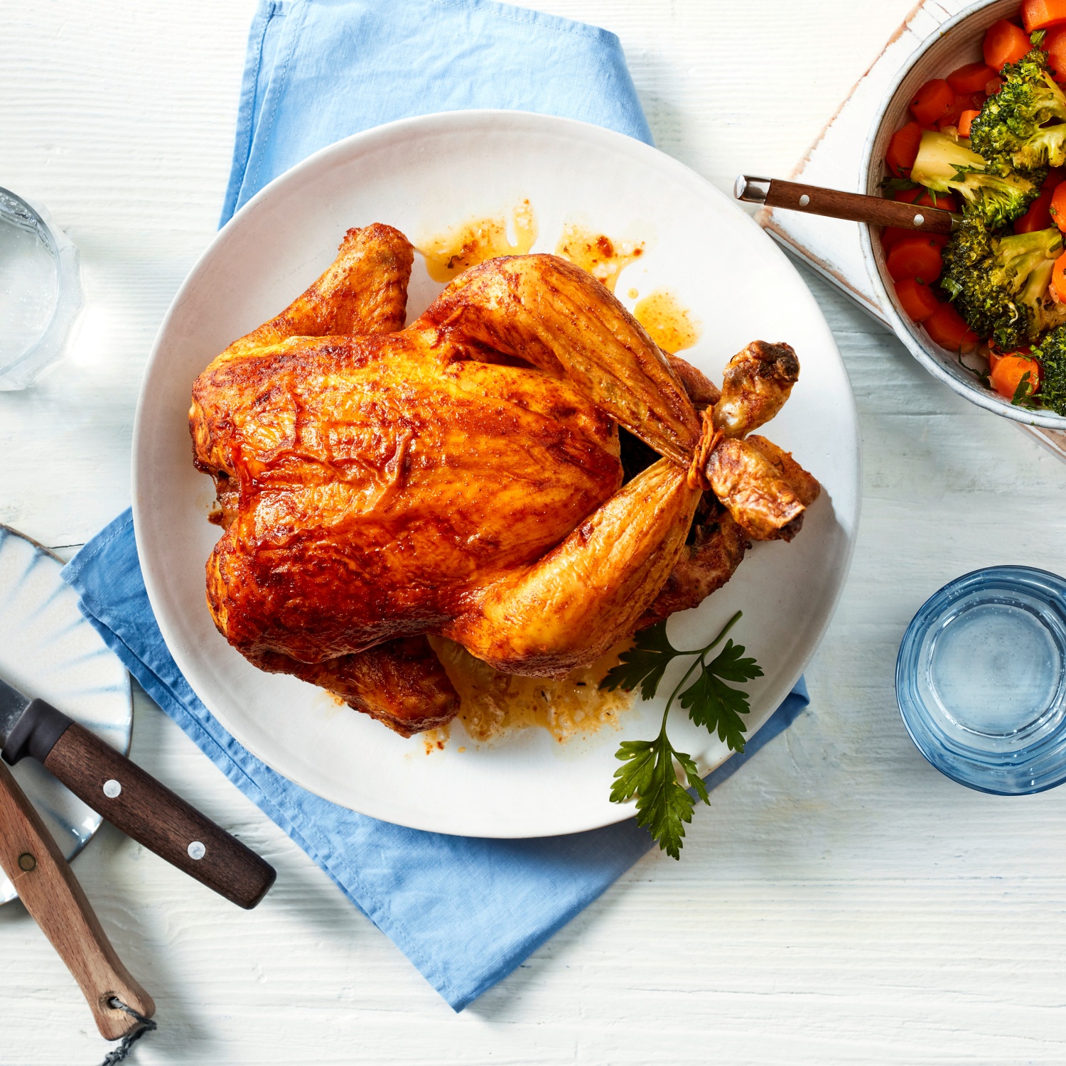 1. Das Hähnchen von innen und außen kräftig salzen und pfeffern. Die Zitrone achteln, die Petersilie grob hacken und das Hähnchen damit füllen. Anschließend die Flügel und die Schenkel binden. Das Paprikapulver sowie das Currypulver mit dem Öl verrühren und das Hähnchen einpinseln.
