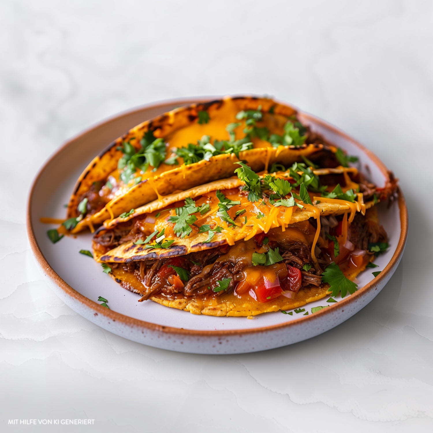 Ein mexikanischer Klassiker: Saftiges, langsam geschmortes Fleisch in knusprig gebratenen Tortillas mit geschmolzenem Käse und frischen Toppings. Zum Rezept