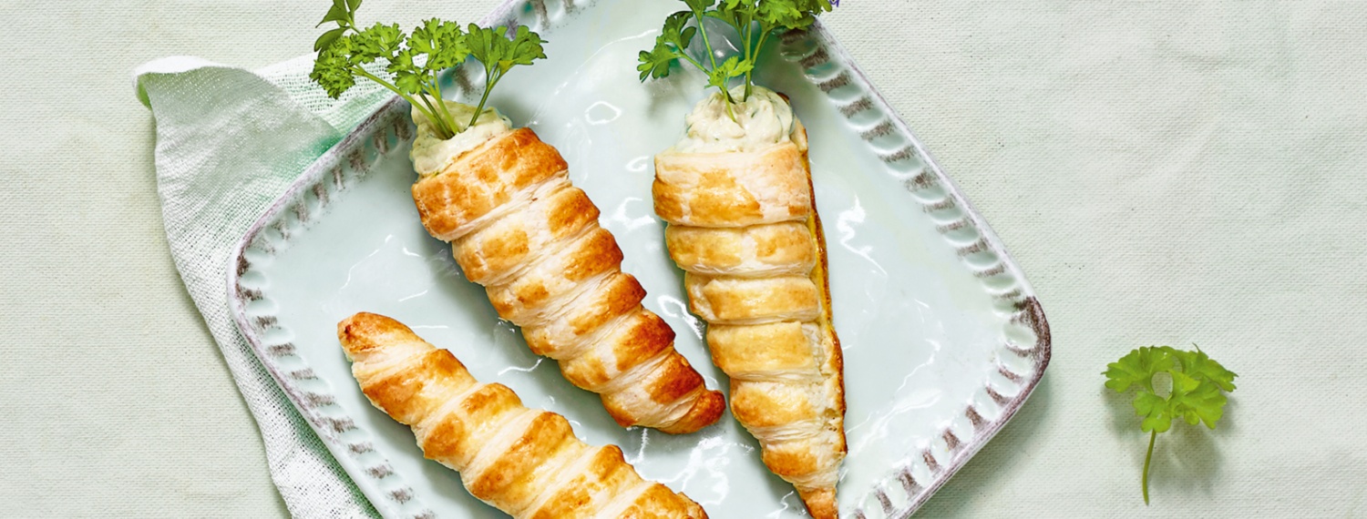 - Die Blätterteig-Möhren an der Öffnung mit frischer Petersilie dekorieren.