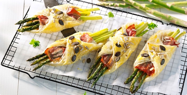 - Die Blätterteigrolle ausrollen und in 6 gleich große Rechtecke schneiden. Die einzelnen Teigplatten mit jeweils einer Scheibe Tiroler Speck belegen und mit der Creme bestreichen. Je 3 Stangen Spargel darauf legen und die Blätterteigrechtecke überlappend verschließen.