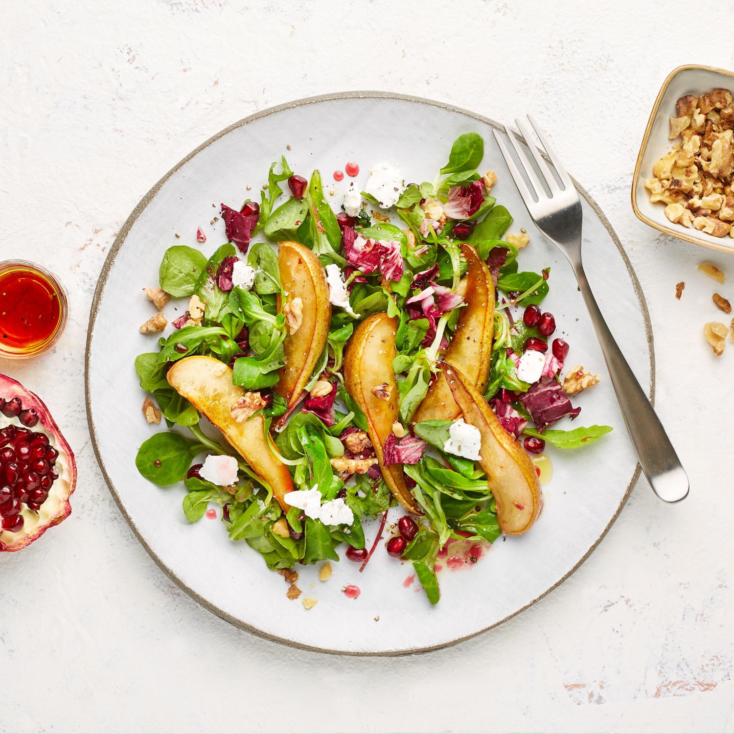 Blattsalat mit karamellisierter Birne und Granatapfelkernen