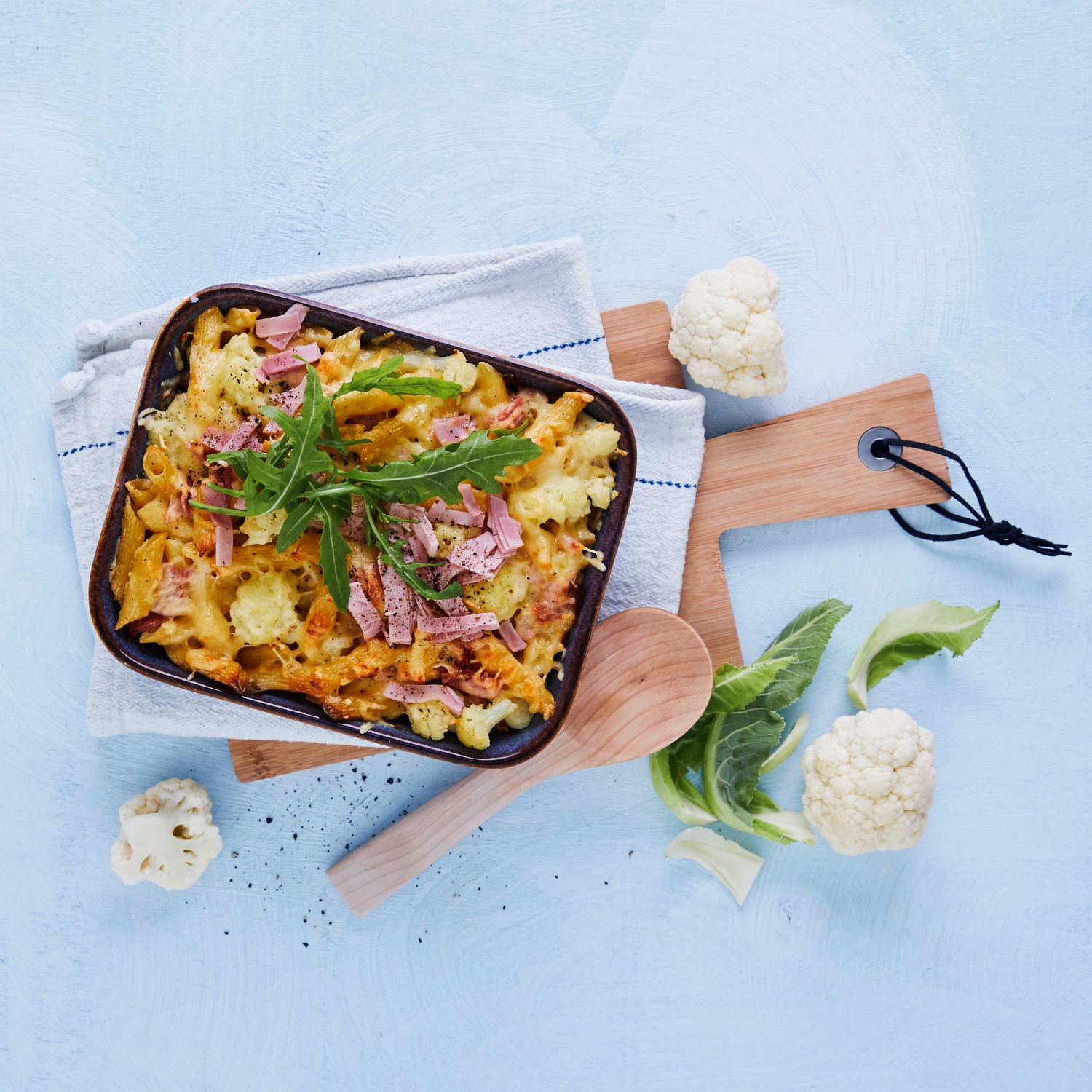 - Nudeln und Blumenkohl in eine gefettete Auflaufform geben. Schinkensoße darüber gießen. Geriebenen Käse darüber streuen. Im vorgeheizten Backofen (E-Herd: 200 °C/ Umluft: 175 °C/ Gas: siehe Hersteller) ca. 25 Minuten überbacken. Blumenkohlauflauf mit Schinken aus dem Ofen nehmen und anrichten. Mit Rucola garnieren und servieren.