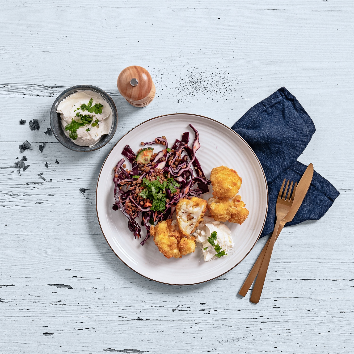 Blumenkohlnuggets mit Rotkohl und Linsengemüse