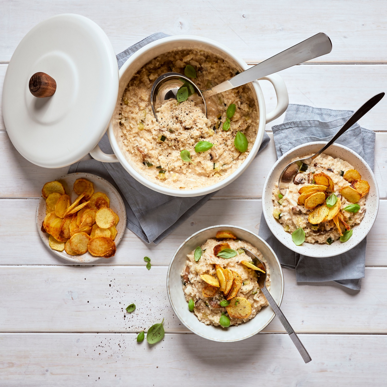 Wo Blumenkohl zu Reis wird: Das vegane Blumenkohlrisotto mit selbstgemachten Kartoffelchips wird durch Kokosmilch noch cremiger. Zum Rezept