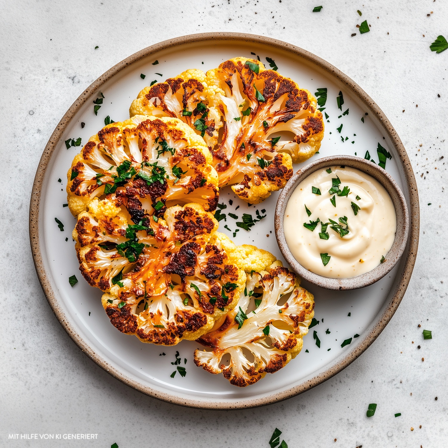 - Die fertig gebackenen Blumenkohlsteaks auf Tellern anrichten. Mit gehackter Petersilie bestreuen und mit Zitronen-Mayonnaise servieren.