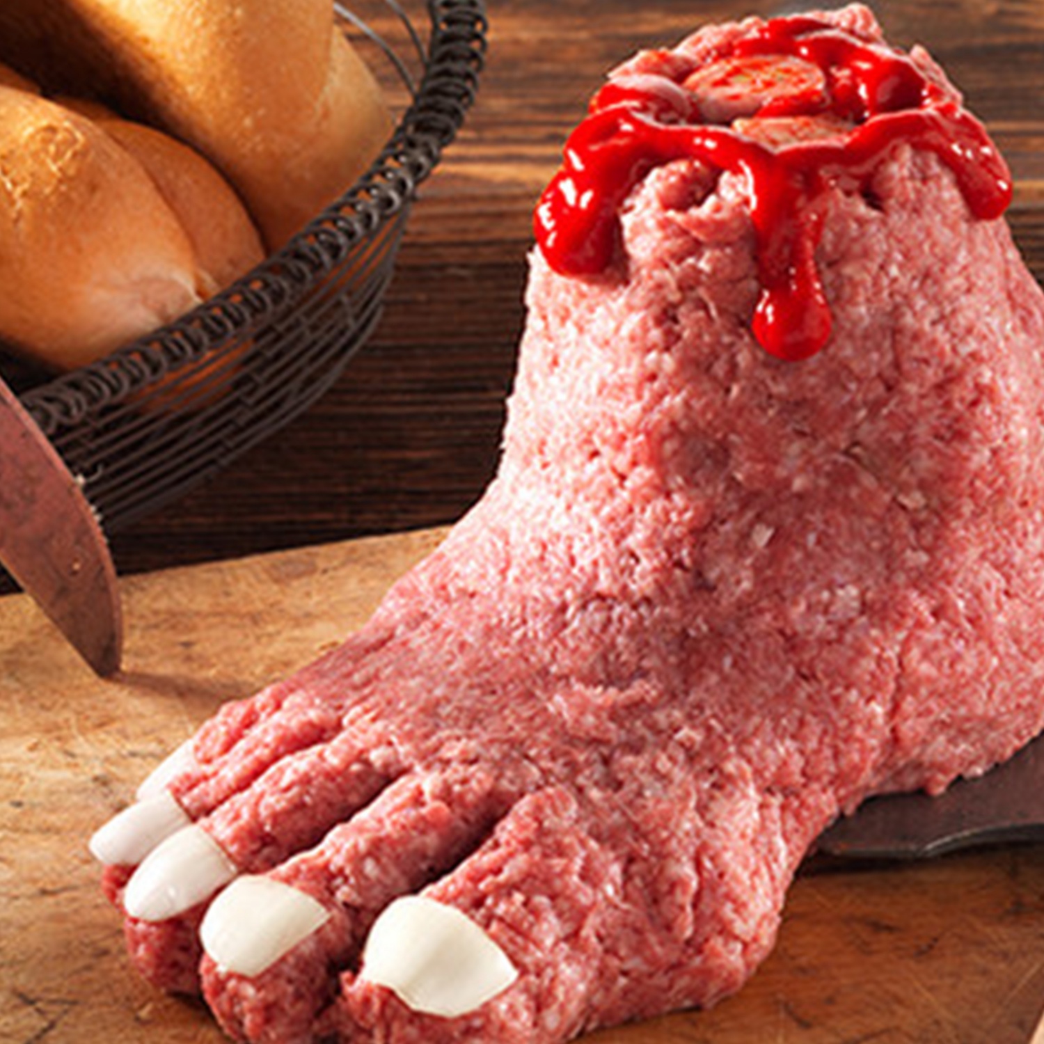 - Das Schweinemett mit Salz und Pfeffer abschmecken und daraus einen Fuß formen. Die Zwiebel schälen, die äußeren Ringe ablösen und daraus die Zehennägel schneiden. Die kleine restliche Zwiebel als Knochen oben in das Bein stecken. Mit Ketchup garnieren.