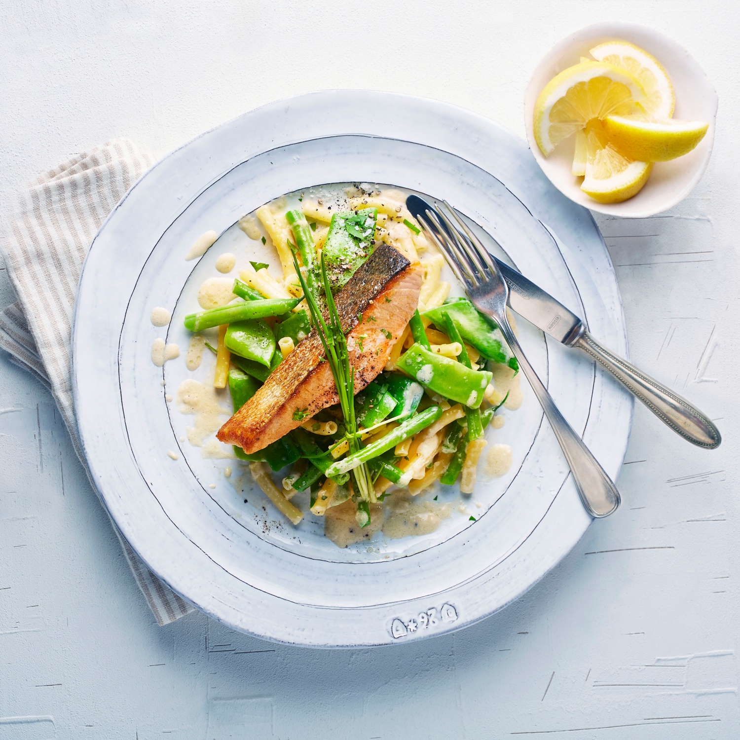 - Die gekochten Nudeln mit den Bohnen vermengen und auf 4 Teller verteilen. Mit dem Reibekäse bestreuen und mit dem restlichen Olivenöl beträufeln. Das Lachsfilet auf die Pasta setzen und sofort servieren.