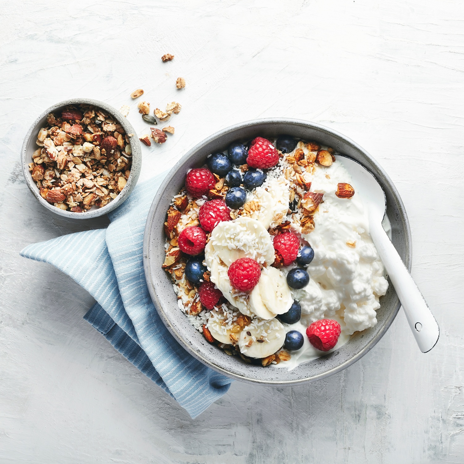 - Den Joghurt und den körnigen Frischkäse verrühren und in Müslischalen anrichten, mit den Bananenscheiben und den Heidelbeeren dekorieren. Mit Granola-Topping und Kokosraspeln garniert servieren.