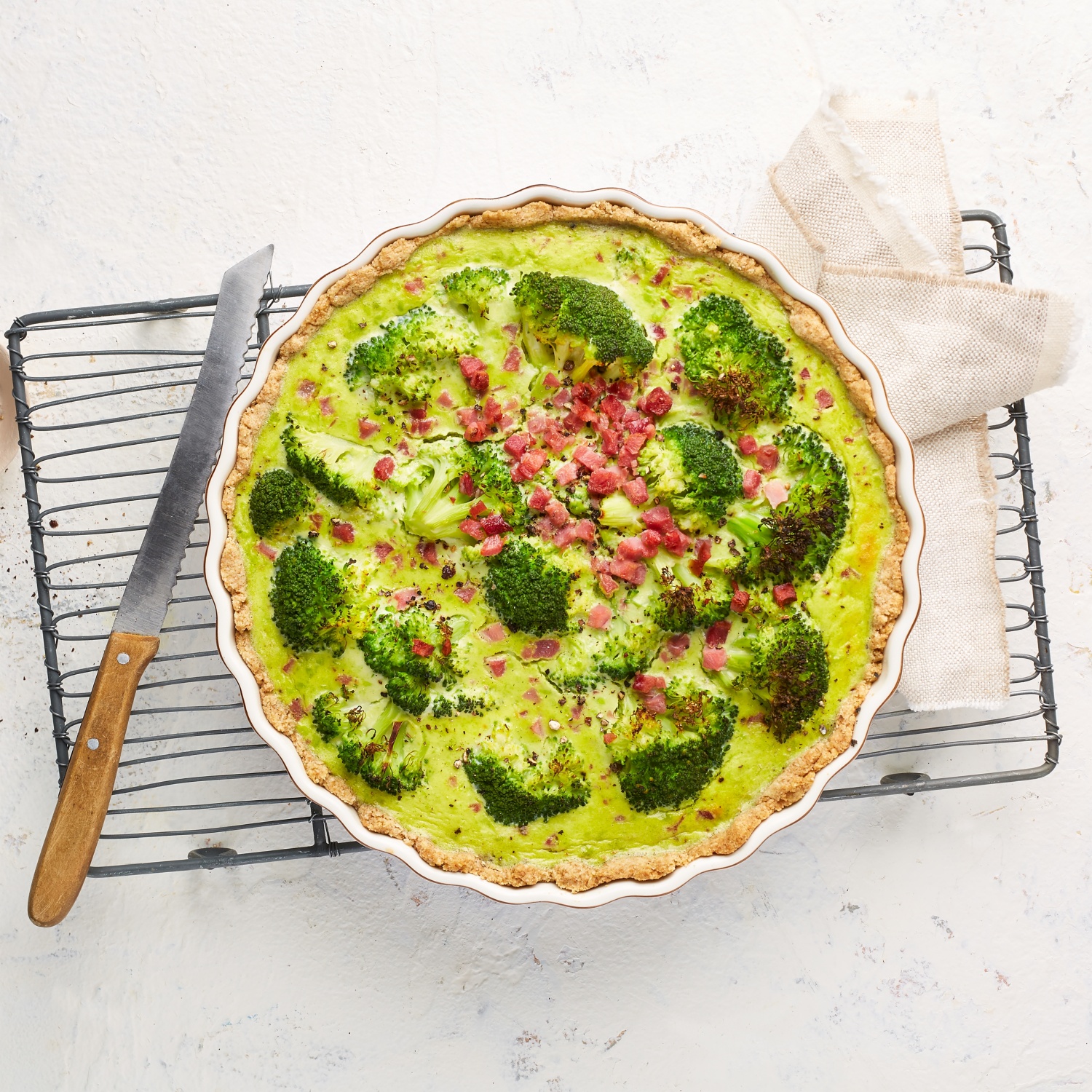 - Die Quiche gleichmäßig mit Brokkoliröschen belegen. Die restlichen Schinkenwürfel und die restliche Eiermasse obenauf geben und die Brokkoli-Quiche ca. 20 – 25 Minuten bei 195 °C Ober- und Unterhitze (175 °C Umluft) backen.