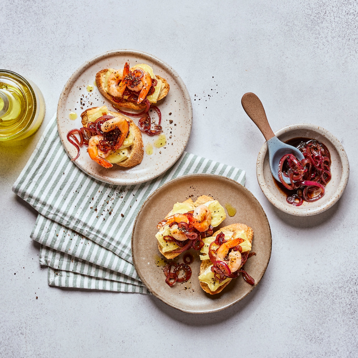 - Die überbackenen Brotscheiben mit den Balsamico-Zwiebeln belegen und die Garnelen darüber verteilen.