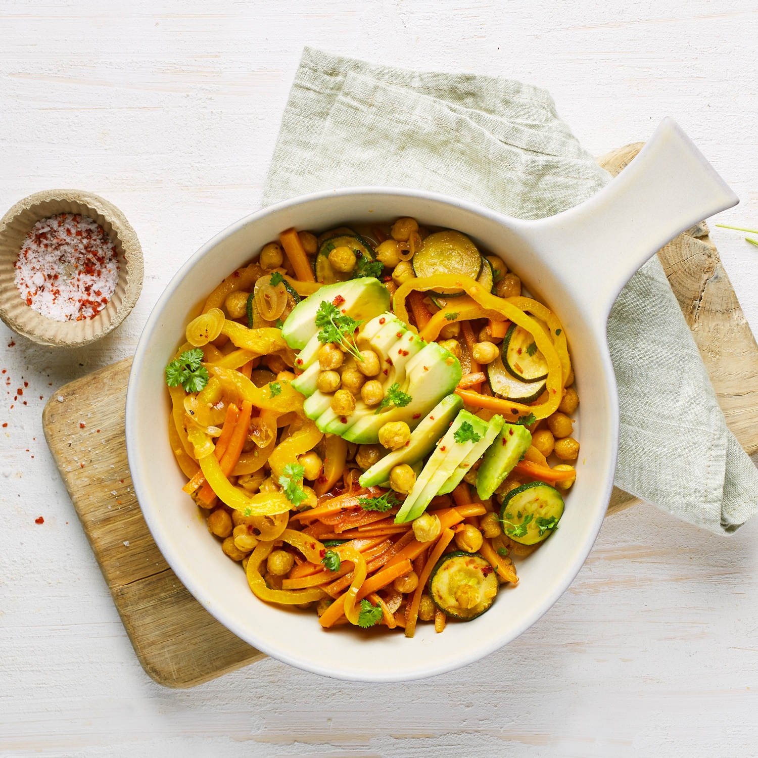 Gemüse satt: Das Pfannengemüse ist pikant mit Chili, Curry, Honig und Limettensaft abgeschmeckt und dank der eiweißreichen Hülsenfrüchte super nahrhaft. Zum Rezept