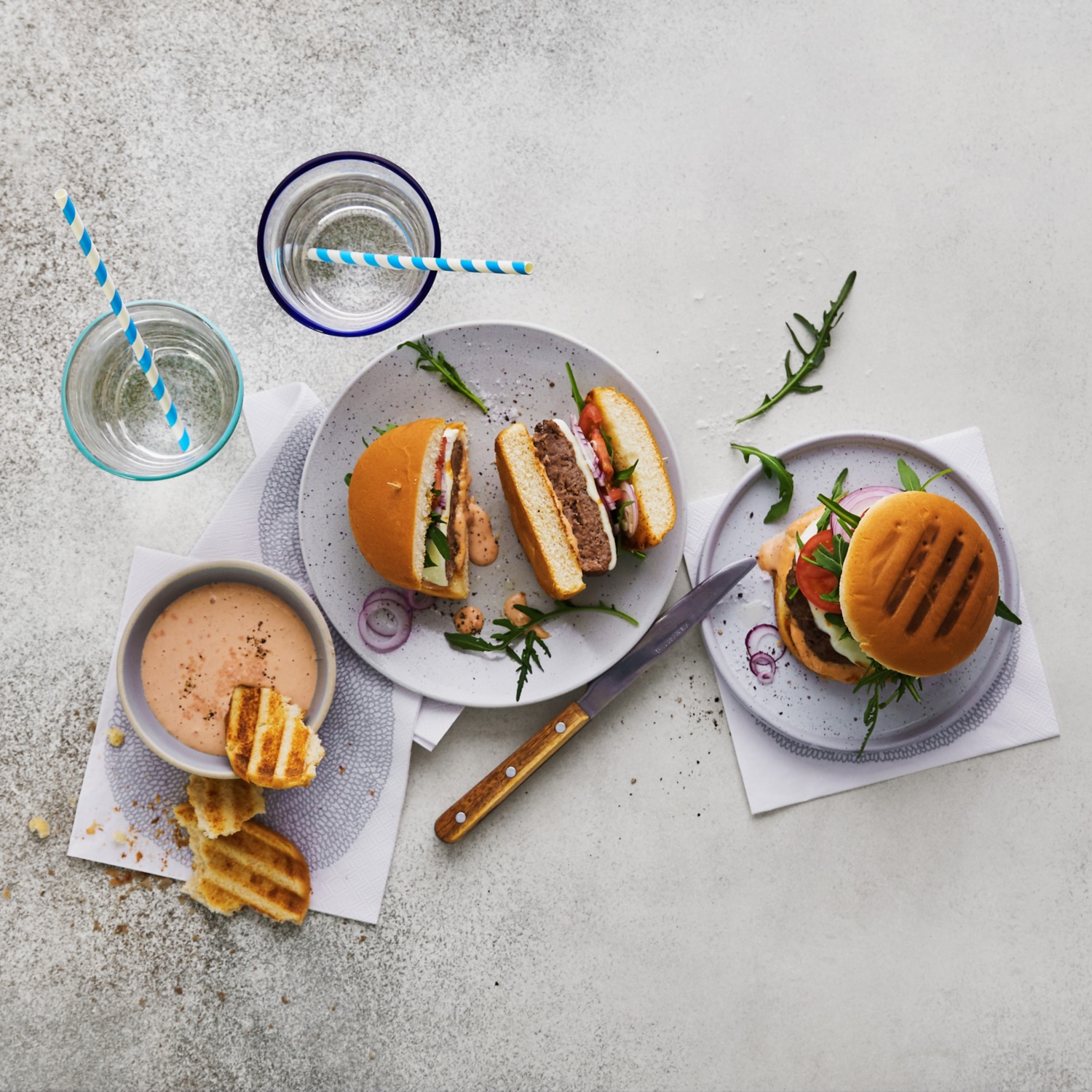 - Auf die Unterseiten der Buns je einen Klecks Chili-Kirsch-Mayonnaise geben, das Fleisch-Patty auflegen und mit Zwiebeln, Tomaten und Rucola belegen.
