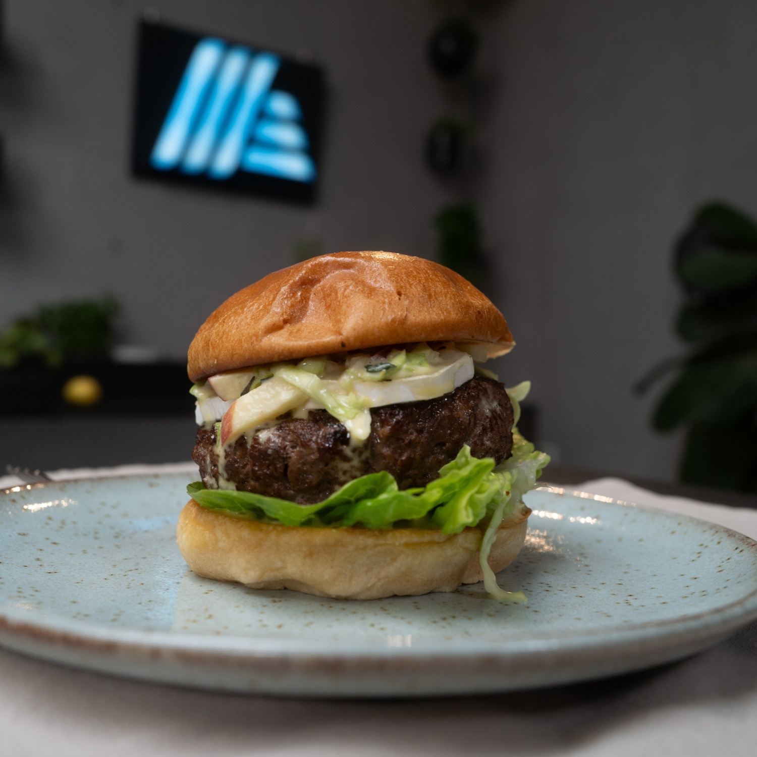 - Die Unterseite der Burger-Buns mit etwas Honig-Senf-Sauce bestreichen. Mit einem Salatblatt belegen. Das Burger-Patty mit dem Ziegenkäse darauflegen. Etwas von dem Coleslaw darübergeben. Den Deckel aufsetzen und fertig!