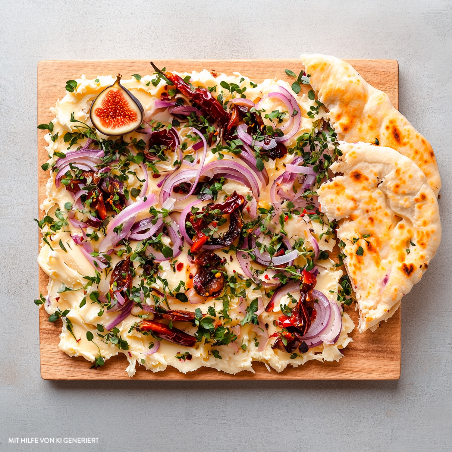 Ein dekoratives Butterbrett, geschmückt mit würzigen Toppings wie Zwiebeln, Chili und frischen Kräutern. Zum Rezept
