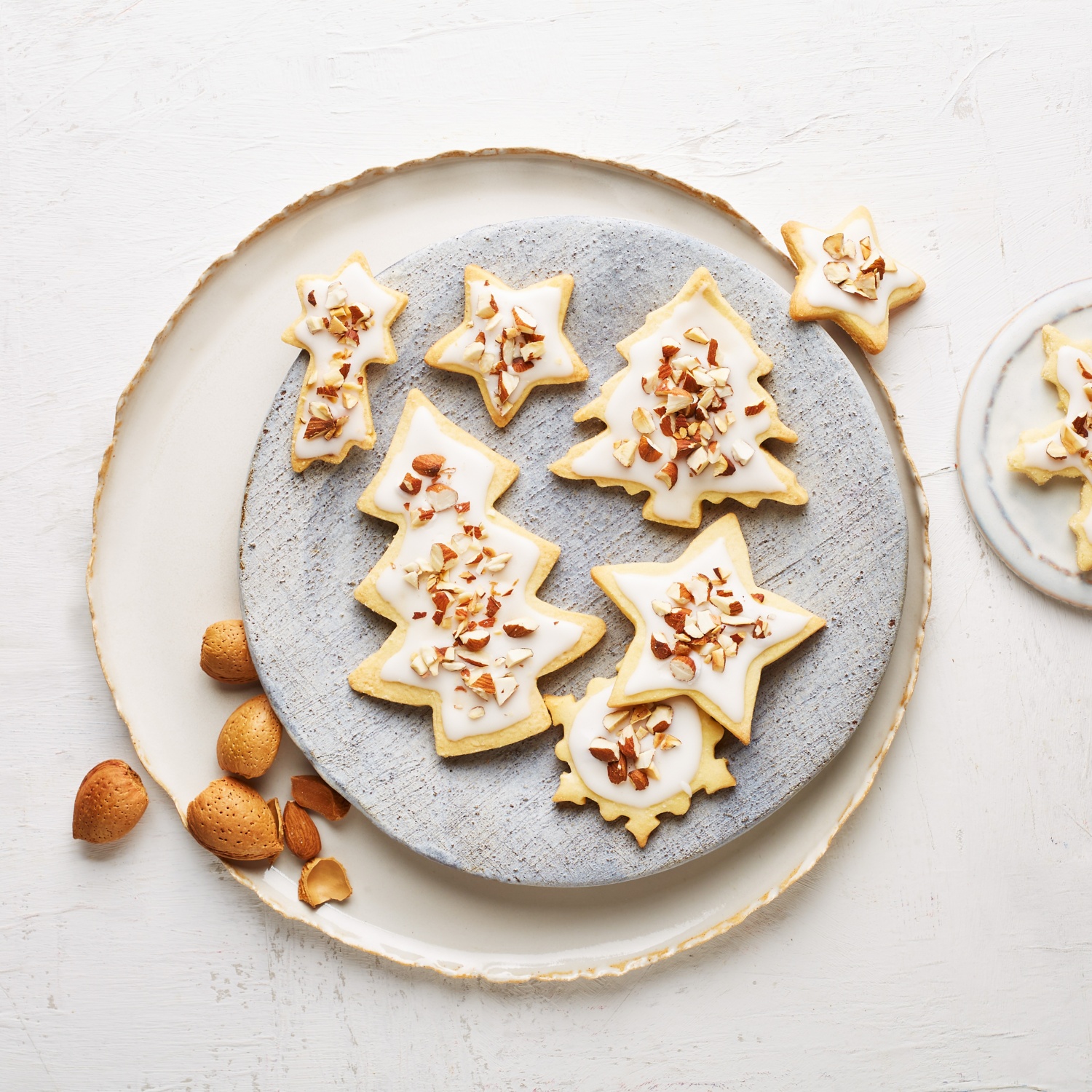 - Plätzchen auf einem Kuchengitter auskühlen lassen. Saft von einer ½ Zitrone mit dem Puderzucker mischen und nach und nach löffelweise Wasser zugeben bis eine cremige Glasur entsteht. Die Plätzchen mit der Glasur überziehen und mit den Mandeln bestreuen.