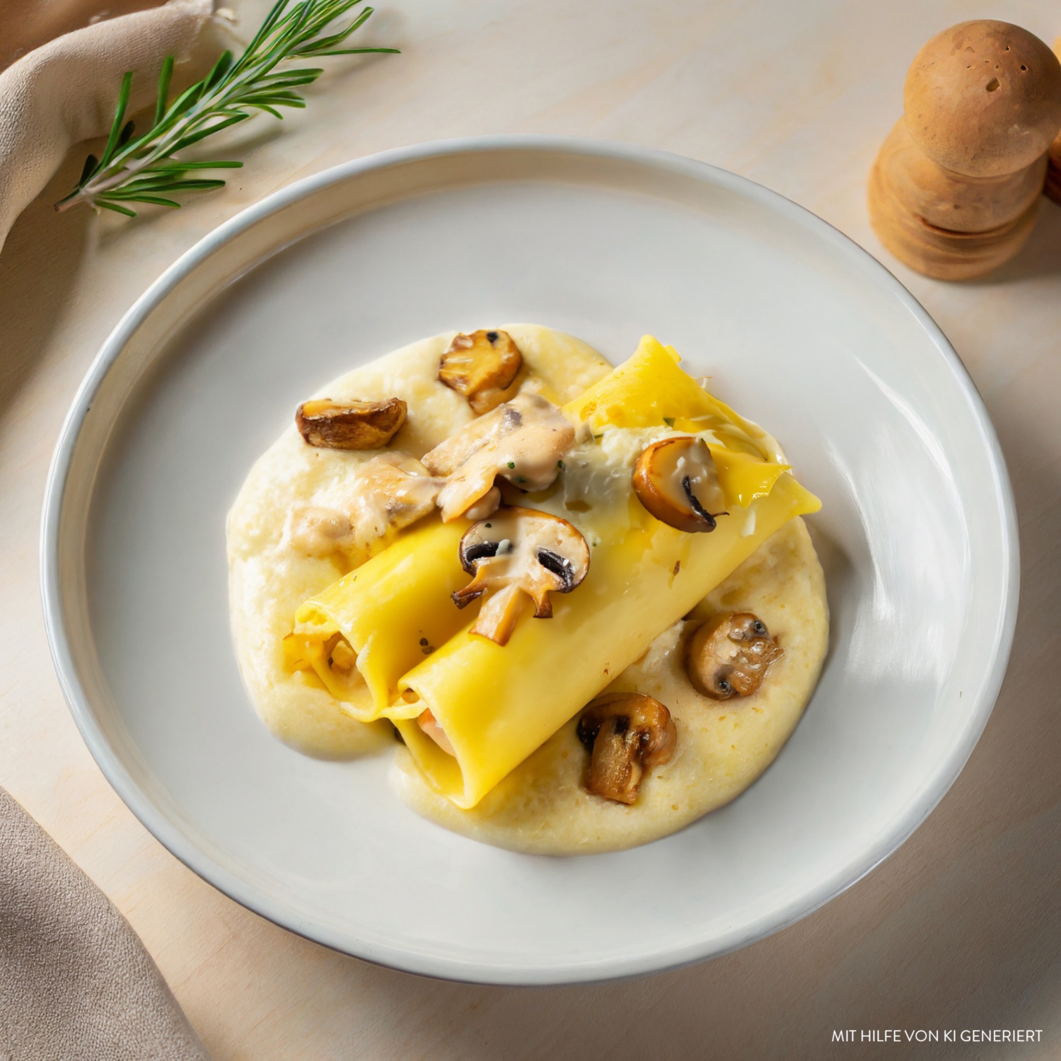 Ein Genuss in jeder Schicht: Cannelloni gefüllt mit saftigem Hähnchen, herzhaften Pilzen und umhüllt von einer cremigen Alfredo-Sauce. Zum Rezept