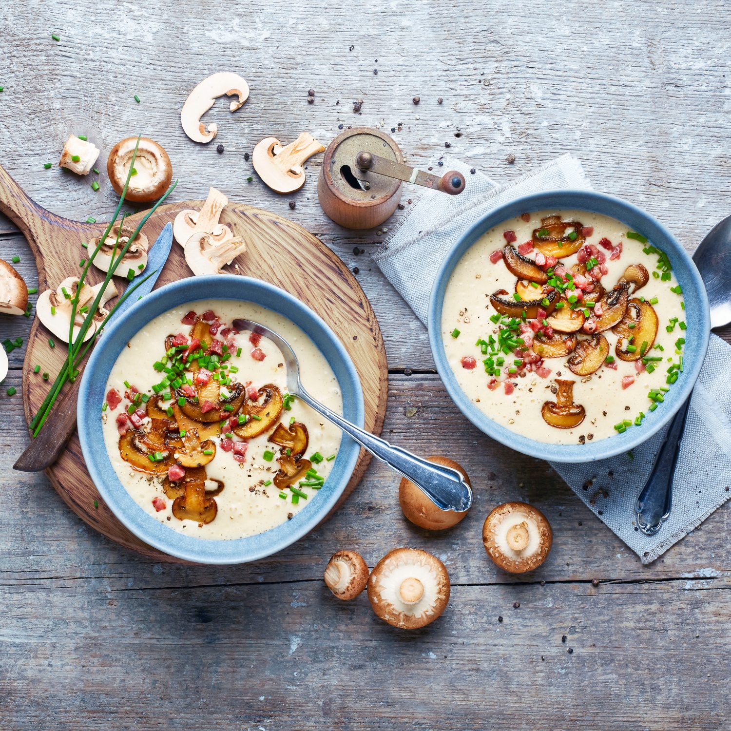 - Schnittlauch abbrausen, abtupfen und in feine Röllchen schneiden. Die Champignon-Rahmsuppe anrichten und mit Schnittlauchröllchen und Speckwürfeln bestreuen.