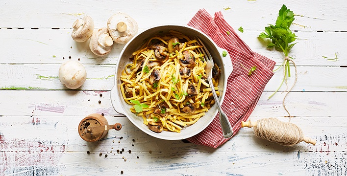 Die herzhafte Champignon-Spätzle-Pfanne ist schnell und unkompliziert zubereitet und schmeckt hervorragend. Mit Petersilie angerichtet wird das Gericht zum Gaumenschmaus. Zum Rezept