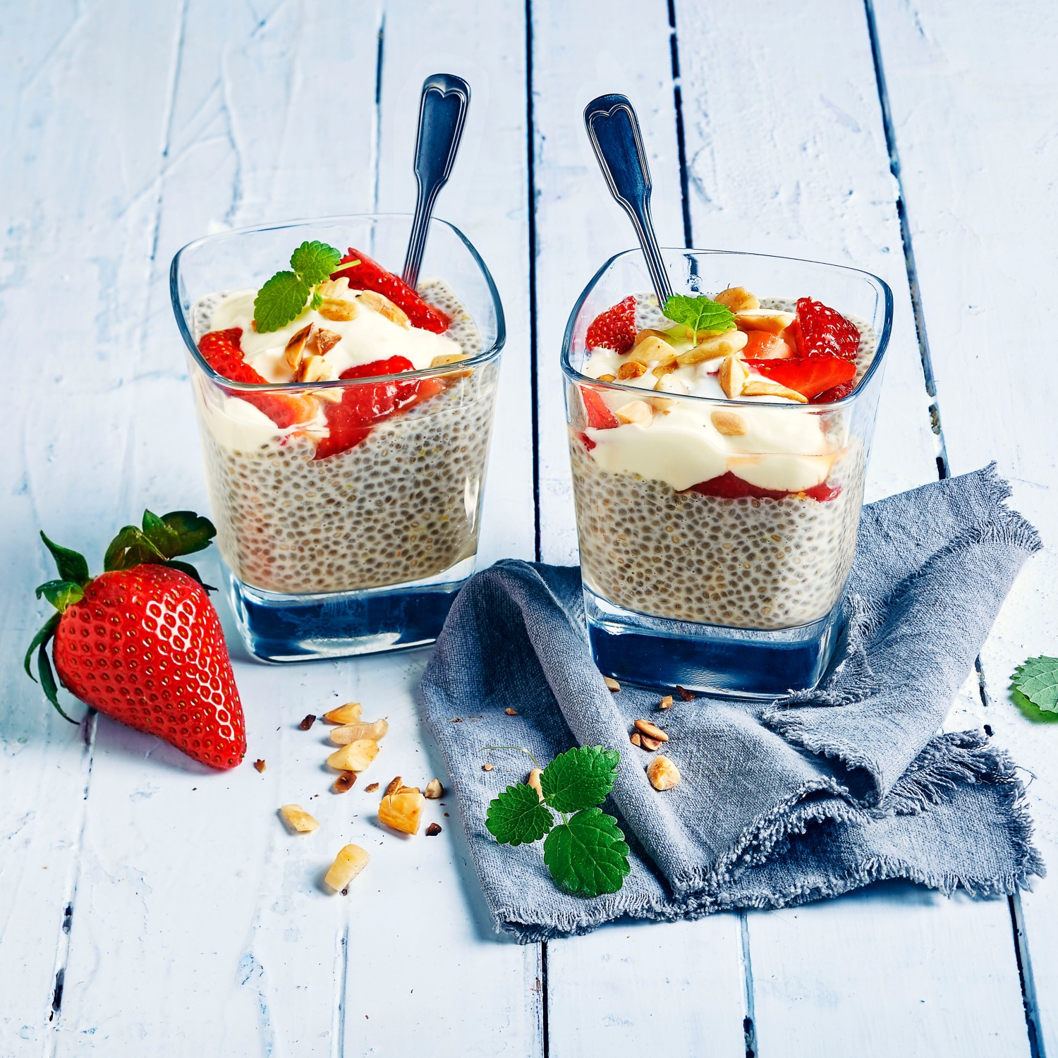 - Joghurt und 1 EL Honig verrühren. Zuerst den Chia-Samen-Pudding auf 4 Gläser verteilen, anschließend Erdbeeren und Joghurt darüber schichten. Mit gerösteten Mandeln und Minze dekorieren.