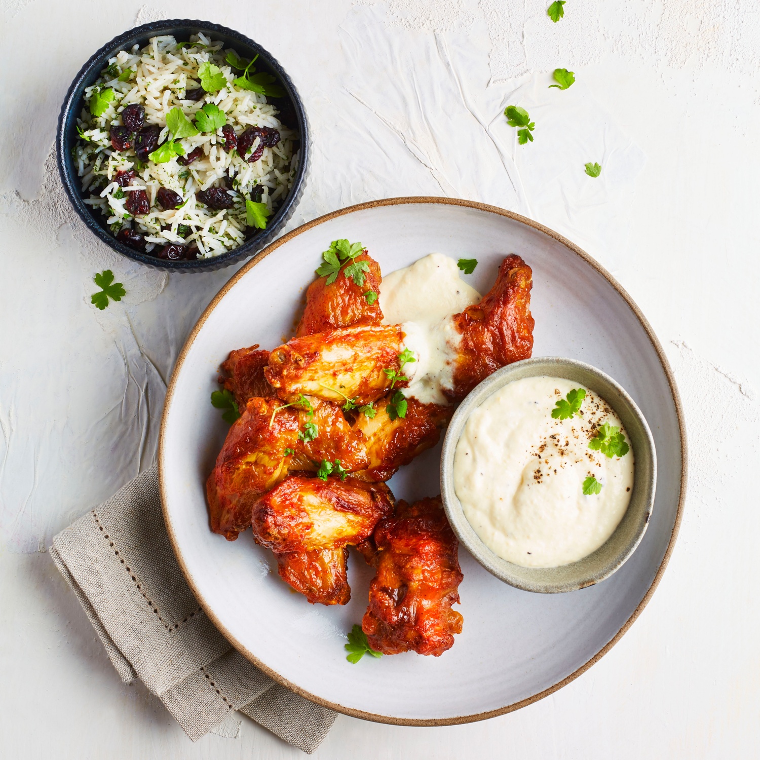 Chicken Wings mit Cheese-Cream und Cranberry-Reis