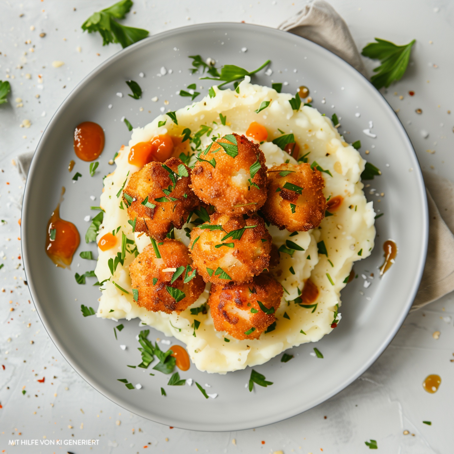 - Das Kartoffelpüree auf Tellern anrichten und die warmen Chili-Cheese Nuggets daraufsetzen. Mit gehackter Petersilie bestreuen und mit Chili-Sauce (optional) garnieren.