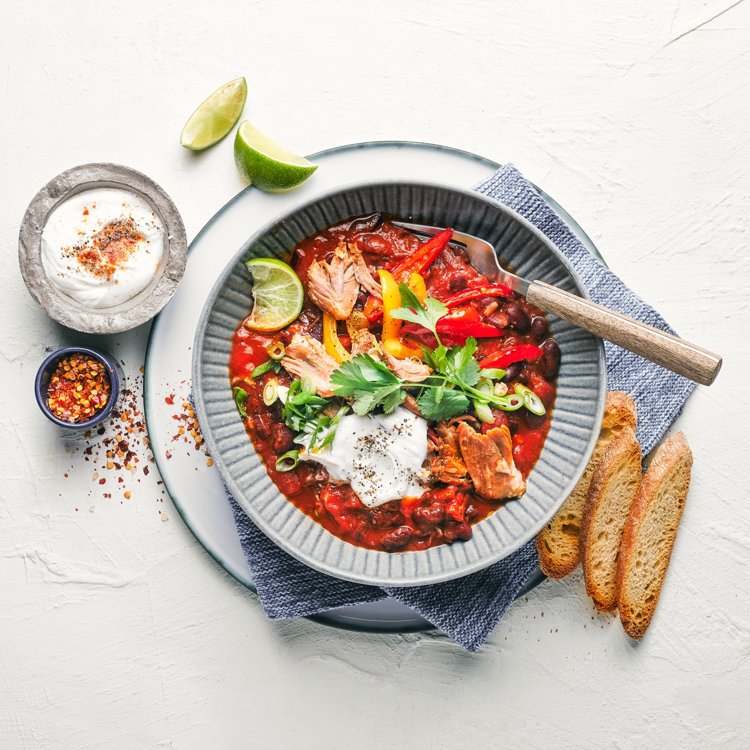 Chili con Carne mit Pulled Pork und Crème fraîche