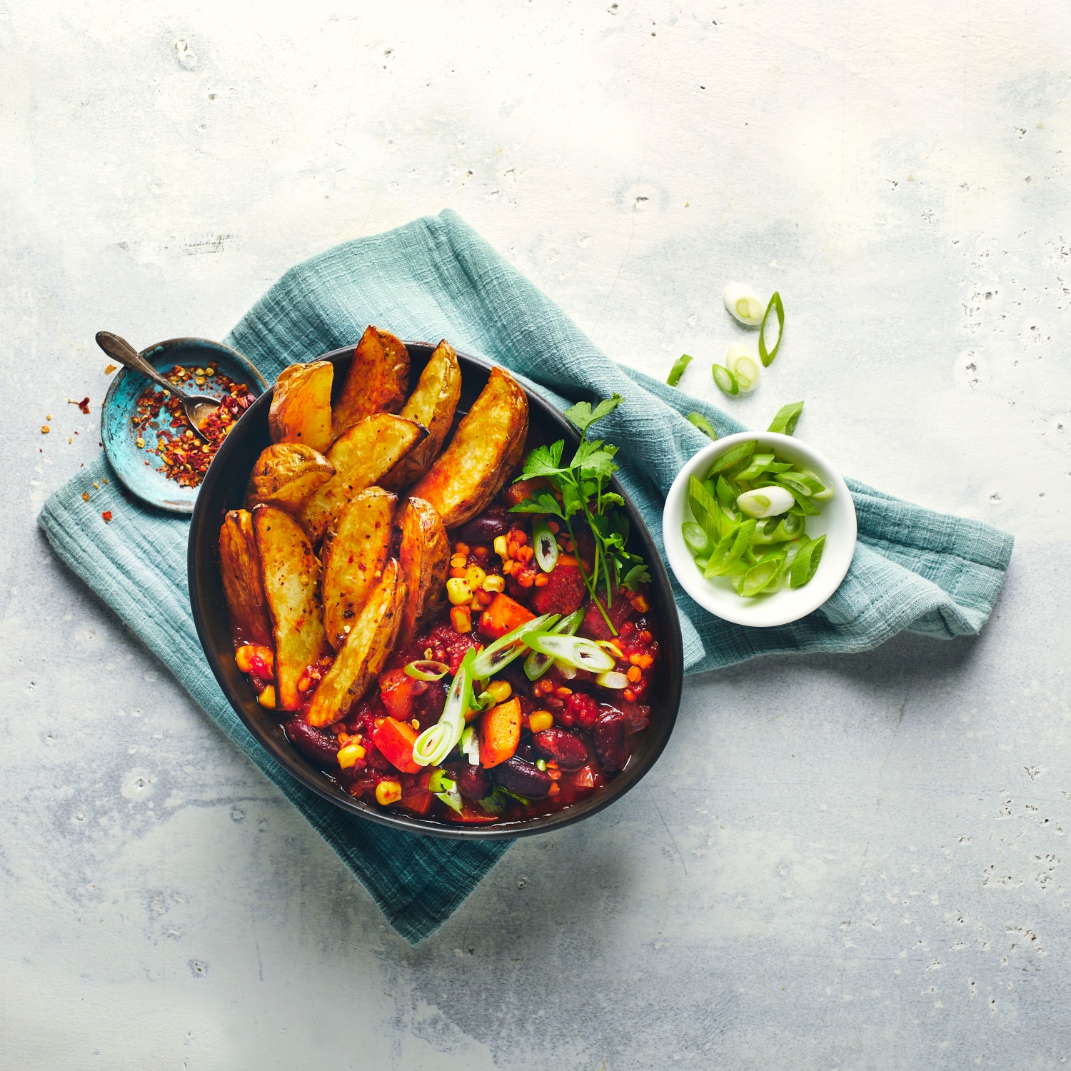Chili sin Carne mit Kartoffelspalten