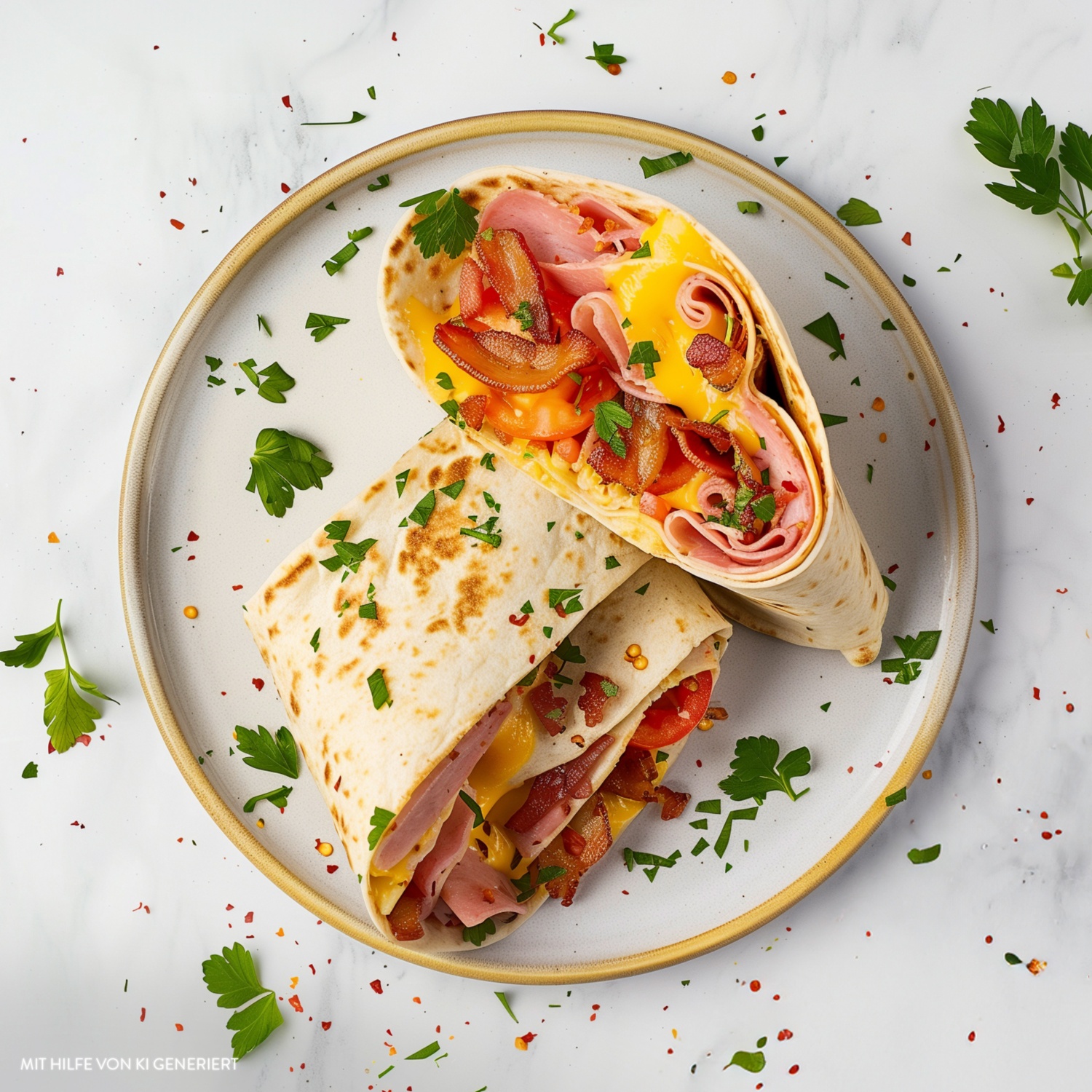 Dieses Club-Wrap kombiniert alle klassischen Zutaten eines Club-Sandwiches im praktischen Wrap-Format – mit herzhaftem Kochschinken, knusprigem Bacon, Käse, frischen Tomaten und Mayonnaise. Zum Rezept