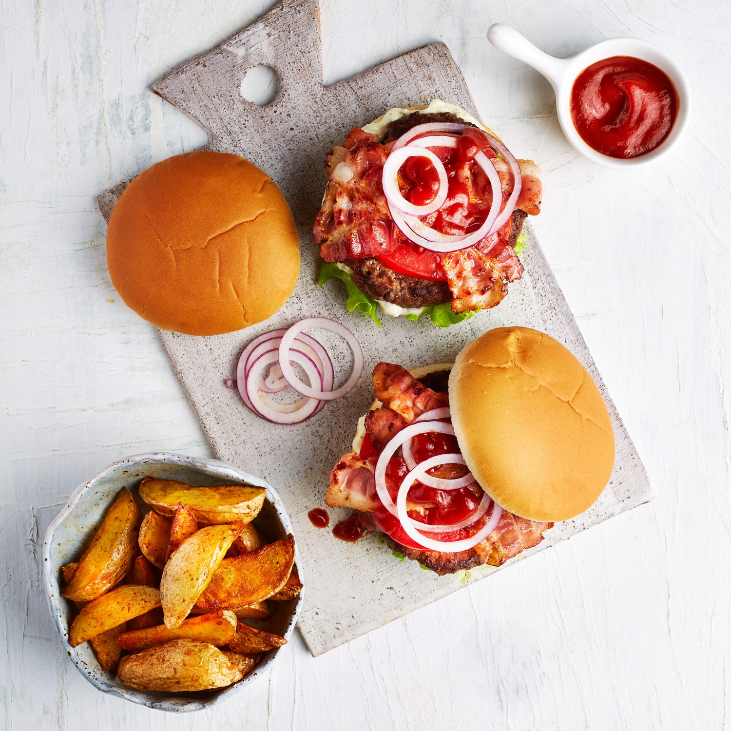- Hamburger-Patties nach Packungsanweisung zubereiten. Burgerbrötchen aufklappen, Schnittflächen der unteren Hälften mit Remoulade bestreichen und mit Salat belegen. Dann gebratene Patties, Tomatenscheiben, knusprigen Bacon und Zwiebelringe darauf verteilen und einige Kleckse Ketchup auf die Zwiebelringe geben.