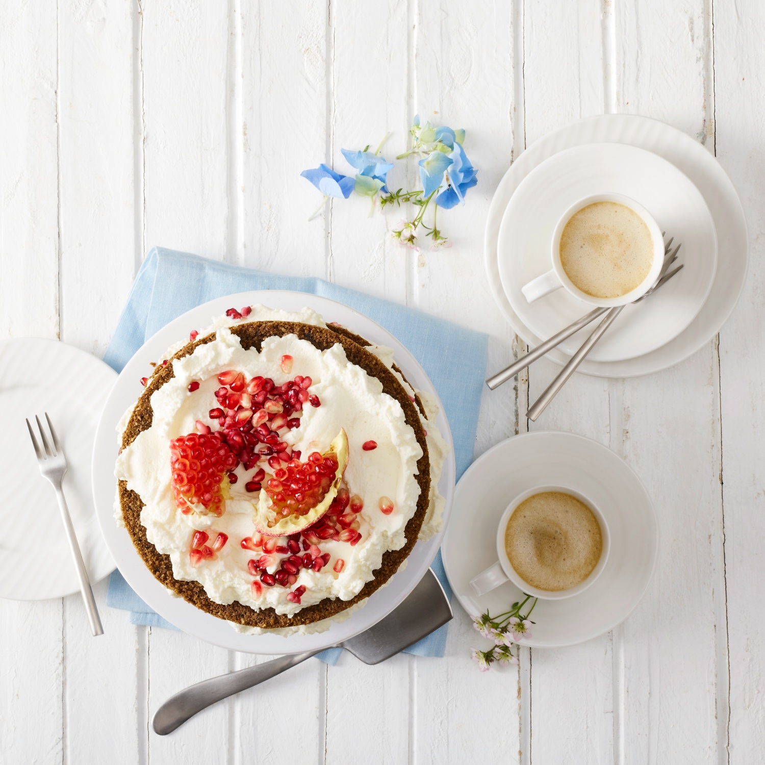 Ein Schichtkuchen, der den intensiven Geschmack von Kakao mit der Süße von Sahne und einer Frische kombiniert, die nur vom Granatapfel kommen kann. Zum Rezept