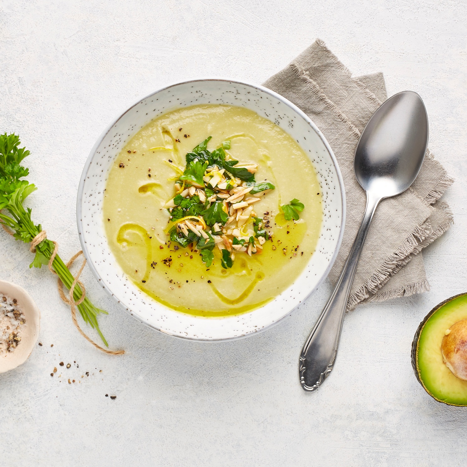 Cremige Kohlrabisuppe mit Avocado und Petersilien-Mandeln